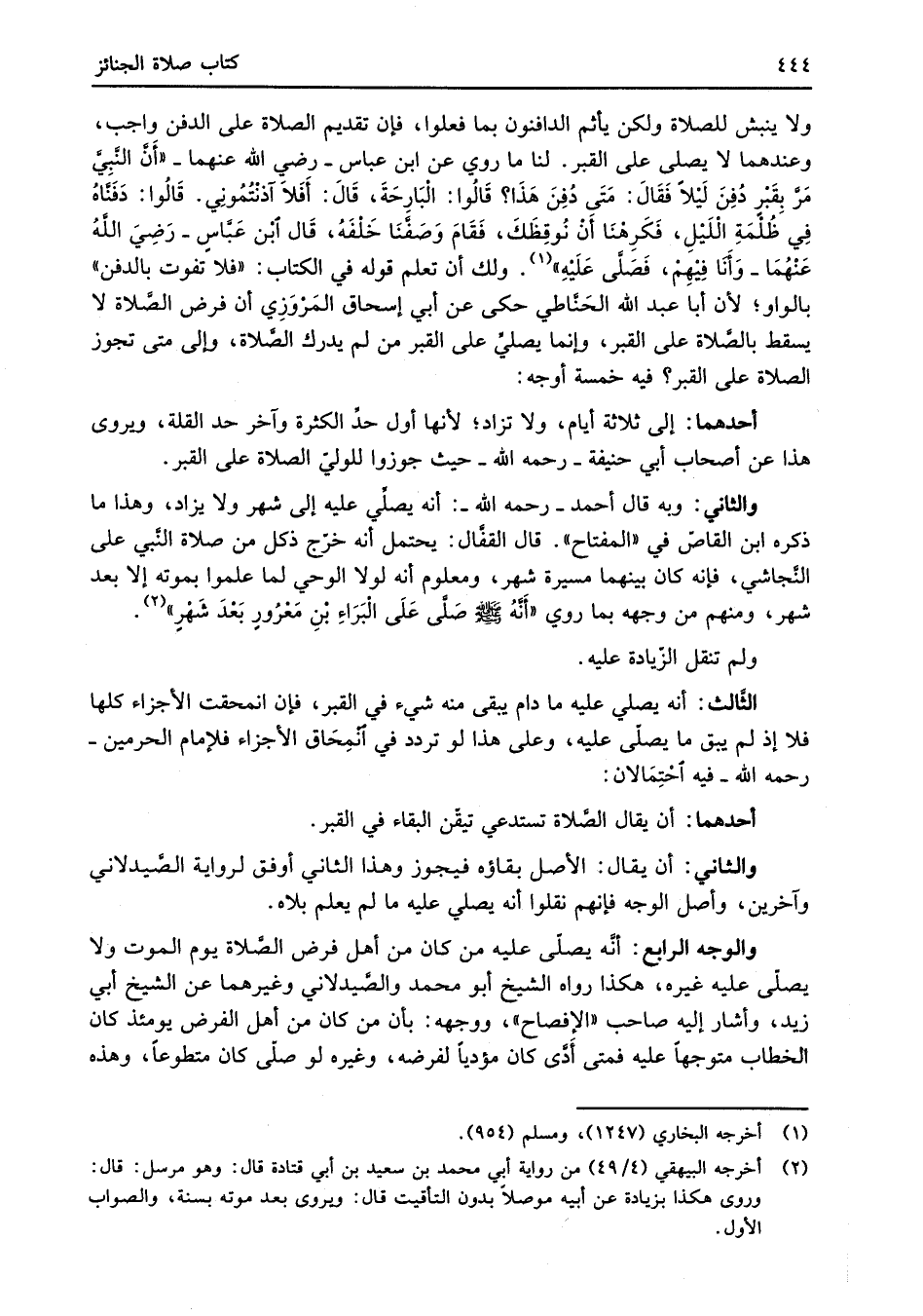 ولا ينبش للصلاة ولكن يأثم الدافنون بما فعلوا، فإن تقديم الصلاة على الدفن واجب، وعندهما لا يصلى على القبر. لنا ما روي عن ابن عباس -رضي الله عنهما- "أنَّ النَّبِيَّ مَرَّ بِقَبْرٍ دُفِنَ لَيْلاً فَقَالَ: مَتَى دُفِنَ هَذَا؟ قَالُوا: الْبَارِحَةَ، قَالَ: أَفَلاَ آذنْتُمُونِي. قَالُوا: دَفَنَّاهُ فِي ظُلْمَةِ الْلَيْلِ، فَكَرِهْنَا أَنْ نُوقِظَكَ، فَقَامَ وَصَفَّنَا خَلْفَهُ، قَال ابْن عَبَّاسٍ -رَضِيَ اللهُ عَنْهُمَا- وَأَنَا فِيْهِمْ، فَصَلَّى عَلَيْهِ" (¬1). ولك أن تعلم قوله في الكتاب: "فلا تفوت بالدفن" بالواو؛ لأن أبا عبد الله الحَنَّاطي حكى عن أبي إسحاق المَرْوَزِي أن فرض الصَّلاة لا يسقط بالصَّلاة على القبر، وإنما يصليِّ على القبر من لم يدرك الصَّلاة، وإلى متى تجوز الصلاة على القبر؟ فيه خمسة أوجه: