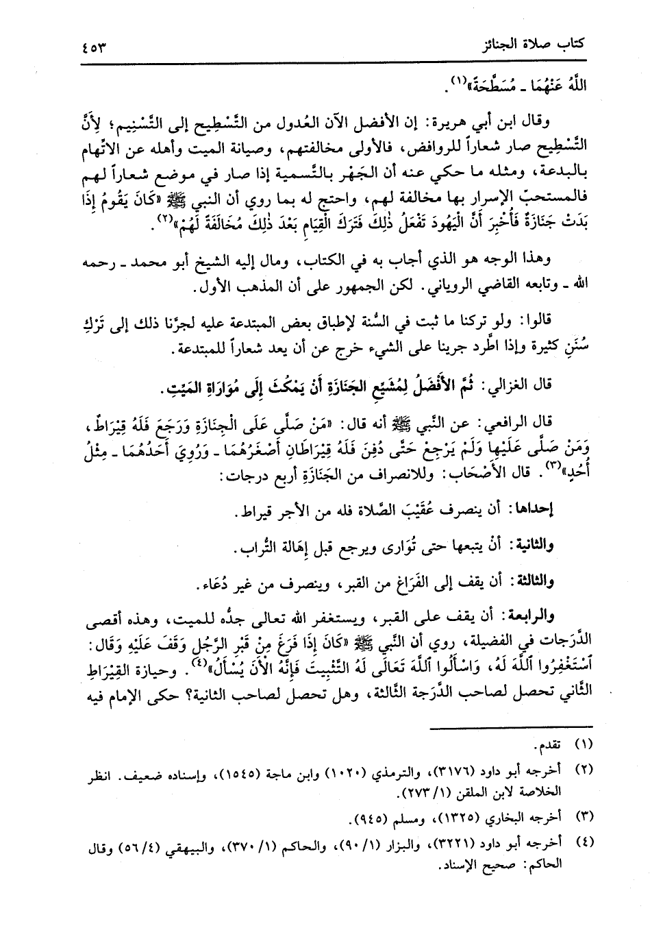 قال الرافعي: عن النَّبي -صلى الله عليه وسلم- أنه قال: "مَن صَلَّى عَلَى الْجِنَازَةِ وَرَجَعَ فَلَهُ قِيْرَاطٌ، وَمَن صَلَّى عَلَيْهِا وَلَمْ يَرجِعْ حَتَّى دُفِنَ فَلَهُ قِيْرَاطَانِ أَصْغَرُهُمَا -وَرُوِيَ أحَدُهُمَا- مِثْلُ أُحُدٍ" (¬3). قال الأَصْحَاب: وللانصراف من الجَنَازَةِ أربع درجات: