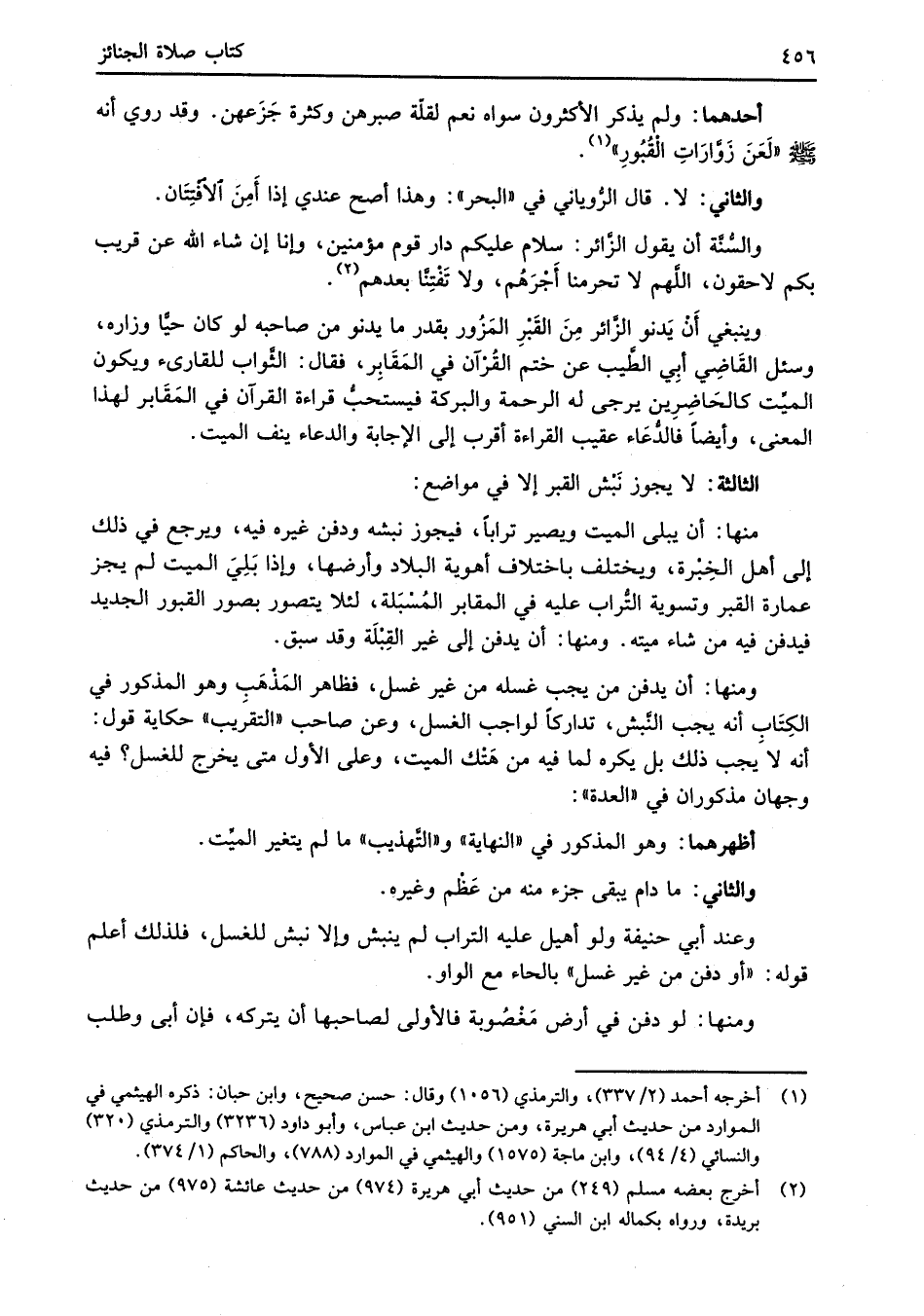 منها: أن يبلى الميت ويصير تراباً، فيجوز نبشه ودفن غيره فيه، ويرجع في ذلك إلى أهل الخِبْرة، ويختلف باختلاف أهوية البلاد وأرضها، وإذا بَلِيَ الميت لم يجز عمارة القبر وتسوية التُّراب عليه في المقابر المُسْبَلة، لئلا يتصور بصور القبور الجديد فيدفن فيه من شاء ميته. ومنها: أن يدفن إلى غير القِبْلَة وقد سبق.