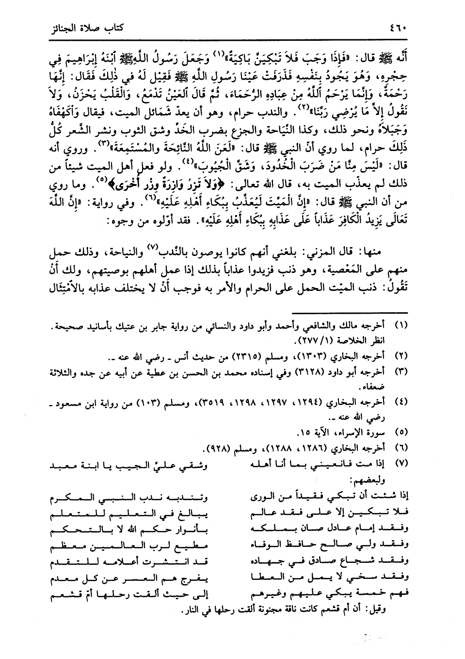 أنه -صلى الله عليه وسلم- قال: "فَإذَا وَجَبَ فَلاَ تَبْكِيَنَّ بَاكيَةٌ" (¬1) وَجَعَلَ رَسُولُ اللهِ -صلى الله عليه وسلم- ابْنَهُ إِبْرَاهِيمَ فِي حِجْره، وَهُوَ يَجُودُ بنَفْسِهِ فَذَرَفَتْ عَيْنَا رَسُولِ اللهِ -صلى الله عليه وسلم- فَقِيْل لَهُ في ذلِكَ فَقَال: إِنَّهَا رَحْمَةٌ، وَإِنَّمَا يَرْحَمُ اللهُ مِنْ عِبَادِهِ الرُّحَمَاءَ، ثُمَّ قَالَ العَيْنُ تَدْمَعُ، وَالْقَلْبُ يَحْزَنُ، وَلاَ نَقُولُ إِلاَّ مَا يُرْضِي رَبَّنَا" (¬2). والندب حرام، وهو أن يعدّ شَمَائل الميت، فيقال وَاكَهْفَاهُ وَجَبَلاَهُ ونحو ذلك، وكذا النِّيَاحة والجزع بضرب الخَدِّ وشق الثوب ونشر الشَّعر كُلُّ ذَلِكَ حرام، لما روي أنَّ النبي -صلى الله عليه وسلم- قال: "لَعَنَ اللهُ النَّائِحَةَ والمُسْتَمِعَةَ" (¬3). وروي أنه قال: "لَيْسَ مِنَّا مَنْ ضَرَبَ الْخُدُودَ، وَشَقَّ الْجُيُوبَ" (¬4). ولو فعل أهل الميت شيئاً من ذلك لم يعذّب الميت به، قال الله تعالى: {وَلَا تَزِرُ وَازِرَةٌ وِزْرَ أُخْرَى} (¬5). وما روي من أن النبي -صلى الله عليه وسلم- قال: "إِنَّ الْمَيِّتَ لَيُعَذَّبُ بِبُكَاءِ أَهْلِهِ عَلَيْهِ" (¬6). وفي رواية: "إِنَّ اللهَ تَعَالَى يَزِيدُ الْكَافِرَ عَذَاباً عَلَى عَذَابِهِ بِبُكَاءِ أَهْلِهِ عَلَيْهِ". فقد أوّلوه من وجوه: