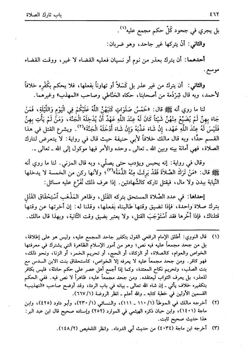 لنا ما روي أنه -صلى الله عليه وسلم- قال: "خَمْسُ صَلَوَاتٍ كَتَبَهُنَّ اللهُ عَلَيْكُمْ فِي الْيَوْمِ وَاللَّيْلَةِ، فَمَنْ جَاءَ بِهِنَّ لَمْ يضَيِّعْ مِنْهُنَّ شَيْئاً كَانَ لَهُ عِنْدَ اللهِ عَهْدٌ أَنْ يُدْخِلَهُ الْجَنَّة، وَمَنْ لَمْ يَأْتِ بِهِنَّ فَلَيْسَ لَهُ عِنْدَ اللهِ عَهْد، إِنْ شَاءَ عَذَّبَهُ وَإِنْ شَاءَ أَدْخَلَهُ الجَنَّةَ" (¬2). ويشرع القتل في هذا القسم حدًّا، وبه قال مالك خلافاً لأبي حنيفة حيث قال في رواية: لا يتعرض لتارك الصلاة، فهي أمانة بينه وبين الله -تعالى- وحده والأمر فيها موكول إلى الله -تعالى-.