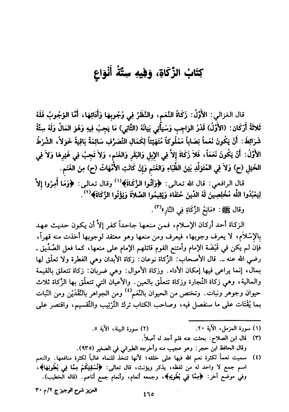 الزكاة أحد أركان الإسلام، فمن منعها جاحداً كفر إلاَّ أن يكون حديث عهد بِالإِسْلاَم، لا يعرف وجوبها، فيعرف ومن منعها وهو معتقد لوجوبها أخذت منه قهراً، فإن لم يكن في قَبْضَة الإمام وامتنع القوم قاتلهم الإمام على منعها، كما فعل الصِّدِّيق -رضي الله عنه-. قال الأصحاب: الزَّكاة نوعان: زكاة الأبدان وهي الفطرة ولا تعلّق لها بمال، إنما يراعى فيها إمكان الأداء. وزكاة الأموال: وهي ضربان: زكاة تتعلق بالقيمة والمالية، وهي زكاة التِّجارة وزكاة تتعلّق بالعين. والأعيان التي تتعلّق بها الزَّكاة ثلاث حيوان وجوهر ونبات. وتختص من الحيوان بالنَّعَم (¬4) ومن الجواهر بالنَّقْدَين ومن النَّبات بما يُقْتَات على ما سنفصل فيه، وصاحب الكتاب ترك التَّرْتِيب والتَّقسيم، واقتصر على
