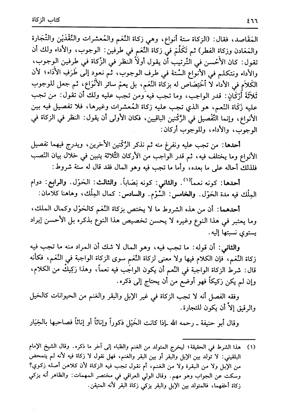 المَقَاصد، فقال: (الزكاة ستة أنواع، وهي زكاة النَّعَم والمُعشرات والنَّقْدَين والتِّجَارة والمَعَادن وزكاة الفطر) ثم تَكَلَّمَ في زكاة النَّعَمِ في طرفين: الوجوب، والأداء ولك أن تقول: كان الأَحْسن في التَّرتيب أن يقول أولَاً النظر في الزَّكاة في طرفين الوجوب، والأداء ونتكلم في الأنواع السِّتة في طرف الوجوب، ثم نعود إلى طَرَفِ الأَدَاء؛ لأن الكَلاَم في الأداء لا اخْتِصَاص له بزكاة النَّعَمِ، بل يعمّ سائر الأَنْوَاع، ثم جعل للوجوب ثَلاثةَ أرْكَانٍ: قدر الواجب، وما تجب فيه ومن تجب عليه ولك أن تقول: من تجب عليه زَكَاة النّعم، هو الذي تجب عليه زكاة المُعشرات وغيرها، فلا تفصيل فيه بين الأنواع، وإنما التَّفْصيل في الرُّكْنين الباقيين، فكان الأولى أن يقول: النظر في الزكاة في الوجوب، والأداء، وللوجوب أركان: