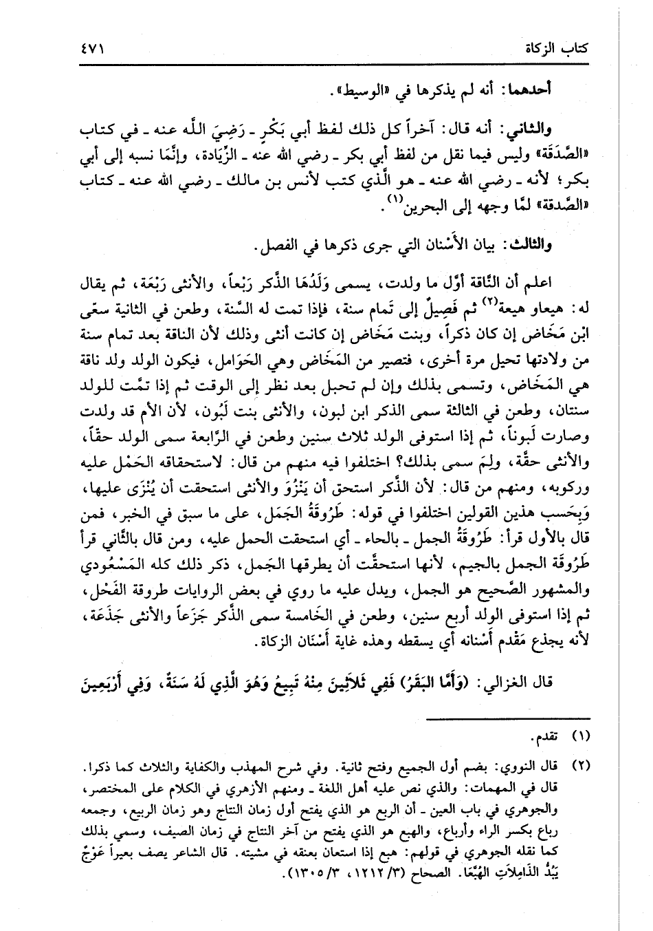 اعلم أن النَّاقة أوَّل ما ولدت، يسمى وَلَدُهَا الذَّكر رَبْعاً، والأنثى رَبْعَة، ثم يقال له: هيعاو هيعة (¬2) ثم فَصِيلٌ إلى تَمام سنة، فإذا تمت له السَّنة، وطعن في الثانية سعى ابْن مَخَاض إن كان ذكراً، وبنت مَخَاض إن كانت أنثى وذلك لأن الناقة بعد تمام سنة من ولادتها تحيل مرة أخرى، فتصير من المَخَاض وهي الحَوَامل، فيكون الولد ولد ناقة هي المَخَاض، وتسمى بذلك وإن لم تحبل بعد نظر إلى الوقت ثم إذا تمَّت للولد سنتان، وطعن في الثالثة سمى الذكر ابن لبون، والأنثى بنت لَبُون، لأن الأم قد ولدت وصارت لَبوناً، ثم إذا استوفى الولد ثلاث سنين وطعن في الرَّابعة سمى الولد حقّاً، والأنثى حقَّة، ولمَ سمى بذلك؟ اختلفوا فيه منهم من قال: لاستحقاقه الحَمْل عليه وركوبه، ومنهم من قال: لأن الذَّكر استحق أن يَنْزُوَ والأنثى استحقت أن يُنْزَى عليها، وَبِحَسب هذين القولين اختلفوا في قوله: طَرُوقَةُ الجَمَل، على ما سبق في الخبر، فمن قال بالأول قرأ: طَرُوقَةُ الجمل -بالحاء- أي استحقت الحمل عليه، ومن قال بالثَّاني قرأ طَرُوقَة الجمل بالجيم، لأنها استحقَّت أن يطرقها الجَمل، ذكر ذلك كله المَسْعُودي والمشهور الصَّحيح هو الجمل، ويدل عليه ما روي في بعض الروايات طروقة الفَحْل، ثم إذا استوفى الولد أربع سنين، وطعن في الخَامسة سمى الذَّكر جَزَعًا والأنثى جَذَعَة، لأنه يجذع مَقْدم أَسْنانه أي يسقطه وهذه غاية أَسْنَان الزكاة.