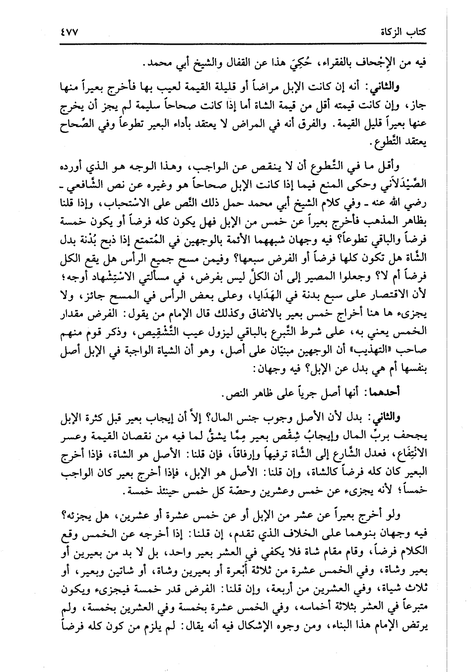 والثاني: أنه إن كانت الإبل مراضاً أو قليلة القيمة لعيب بها فأخرج بعيراً منها جاز، وإن كانت قيمته أقل من قيمة الشاة أما إذا كانت صحاحاً سليمة لم يجز أن يخرج عنها بعيراً قليل القيمة. والفرق أنه في المراض لا يعتقد بأداء البعير تطوعاً وفي الصحاح يعتقد التَّطوع.