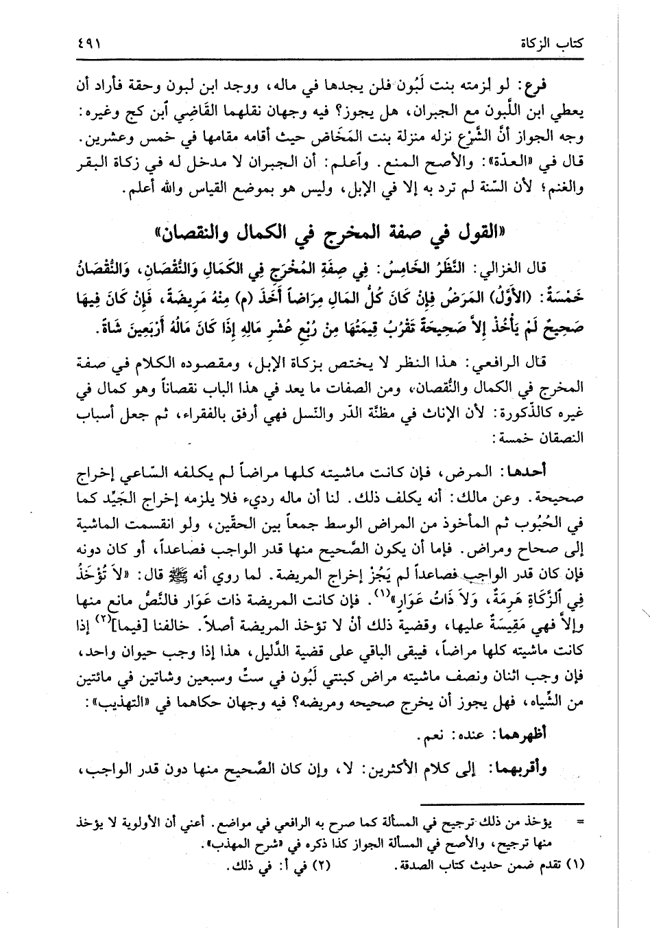 قال الغزالي: النَّظَرُ الخَامِسُ: فِي صِفَةِ المُخْرَجِ فِي الكمَالِ وَالنُّقْصَانِ، وَالنُّقْصَانُ خَمْسَةٌ: (الأَوَّلُ) المَرَضُ فِإنْ كَانَ كُلُّ المَالِ مِرَاضًا أَخَذَ (م) مِنْهُ مَرِيضَةً، فَإنْ كَانَ فِيهَا صَحِيحٌ لَمْ يَأخُذْ إِلاَّ صَحِيحَةً تقَرُبُ قِيمَتُهَا مِنْ رُبْعِ عُشْرِ مَالِهِ إِذَا كَانَ مَالُهُ أَرْبَعِينَ شاةً.