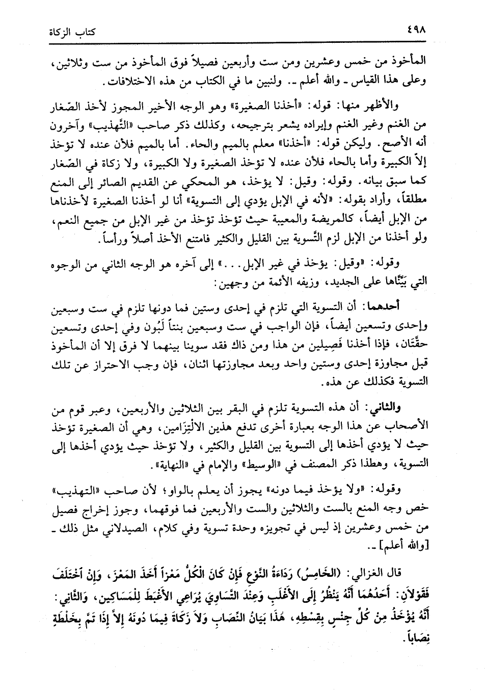 قال الغزالي: (الخَامسُ) رَدَاءَةُ النَّوْعِ فَإِنْ كَانَ الْكُلُّ مَعْزاً أَخَذَ المَعْزَ، وَإِنْ اخْتَلَفَ فَقَوْلاَنِ: أَحَدُهُمَا أنَّهُ يَنْظُرُ إلَى الأغْلَبِ وَعِنْدَ التَّسَاوِيَ يُرَاعِي الأَغْبَطَ لِلْمَسَاكين، وَالثَّانِي: أنَّهُ يؤْخَذ مِنْ كُلِّ جِنْسٍ بِقِسْطِهِ، هَذَا بَيَانُ النِّصَابِ وَلاَ زَكَاةَ فِيمَا دُونَهُ إلا إِذَا تَمَّ بِخَلْطَةٍ نِصَاباً.