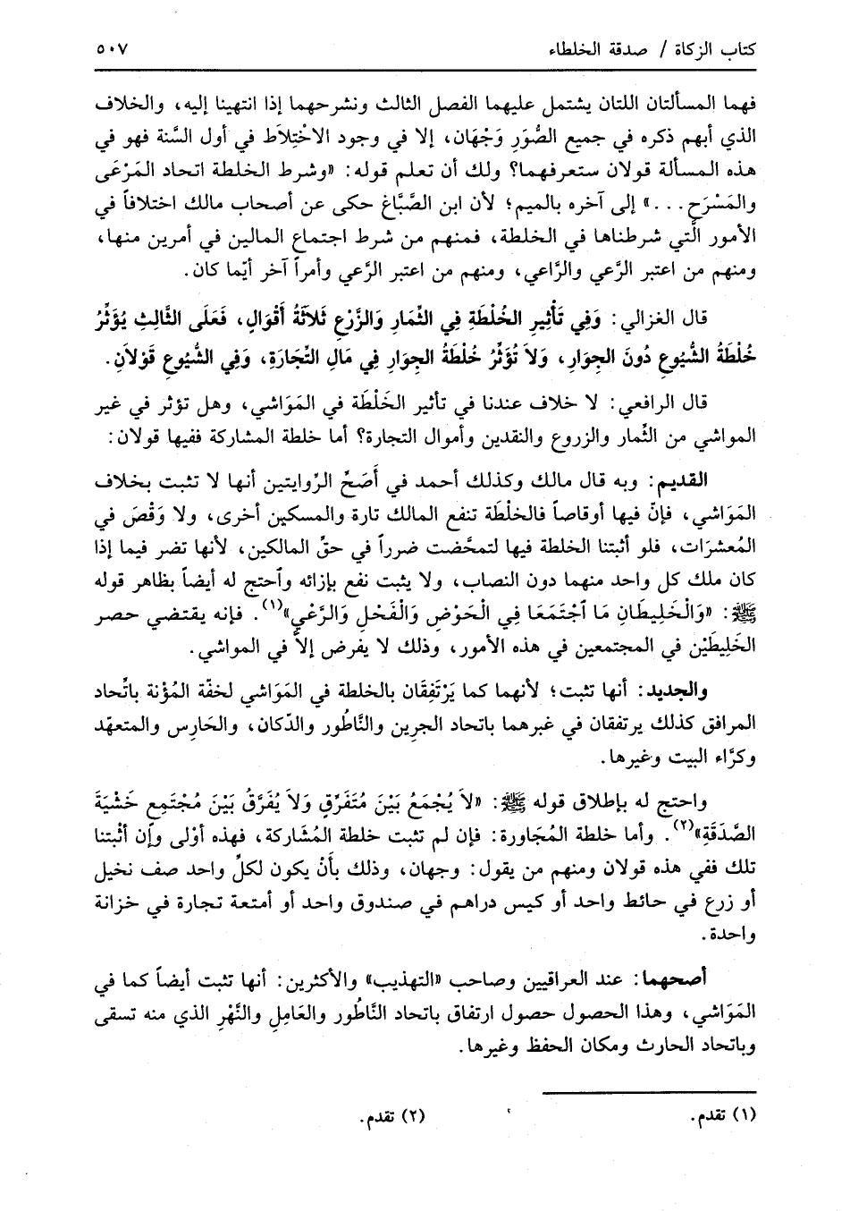 قال الرافعي: لا خلاف عندنا في تأثير الخَلْطَة في المَوَاشي، وهل تؤثر في غير المواشي من الثِّمار والزروع والنقدين وأموال التجارة؟ أما خلطة المشاركة ففيها قولان: