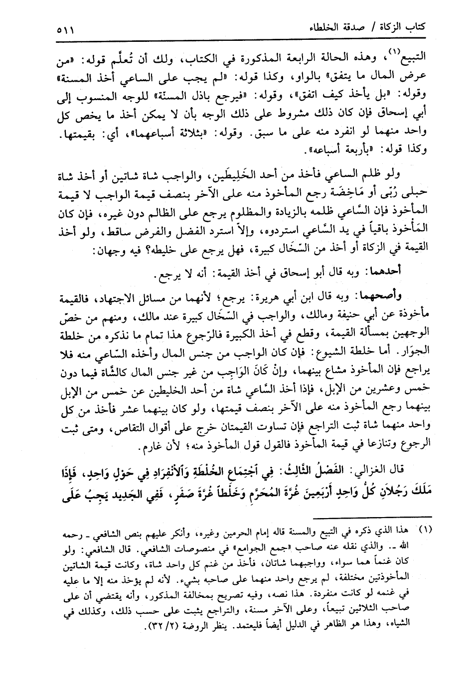 وأصحهما: وبه قال ابن أبي هريرة: يرجع؛ لأنهما من مسائل الاجتهاد، فالقيمة مأخوذة عن أبي حنيفة ومالك، والواجب في السّخَال كبيرة عند مالك، ومنهم من خصّ الوجهين بمسألة القيمة، وقطع في أخذ الكبيرة فالرجوع هذا تمام ما نذكره من خلطة الجوَار. أما خلطة الشيوع: فإن كان الواجب من جنس المال وأخذه السّاعي منه فلا يراجع فإن المأخوذ مشاع بينهما، وإنْ كَانَ الوَاجِب من غير جنس المال كالشَّاة فيما دون خمس وعشرين من الإبل، فإذا أخذ السَّاعي شاة من أحد الخليطين عن خمس من الإبل بينهما رجع المأخوذ منه على الآخر بنصف قيمتها، ولو كان بينهما عشر فأخذ من كل واحد منهما شاة ثبت التراجع فإن تساوت القيمتان خرج على أقوال التقاص، ومتى ثبت الرجوع وتنازعا في قيمة المأخوذ فالقول قول المأخوذ منه؛ لأن غارم.