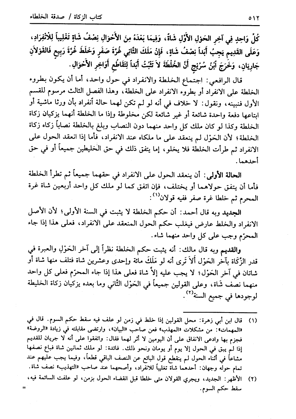 والقديم وبه قال مالك: أنه يثبت حكم الخلطة نظراً إلى آخر الحَوْلِ والعبرة في قدر الزَّكَاة بآخر الحَوْل أَلاَ تَرى أنه لو مَلَكَ مائة وإحدى وعشرين شاة فتلف منها شاة أو شاتان في آخر الحَوْل؛ لا يجب عليه إلاَّ شاة فعلى هذا إذا جاء المحرم فعلى كل واحد منهما نصف شَاة، وعلى القولين جميعاً في الحَوْل الثّاني وما بعده يزكيان زكاة الخليطة لوجودها في جميع السنة (¬2).