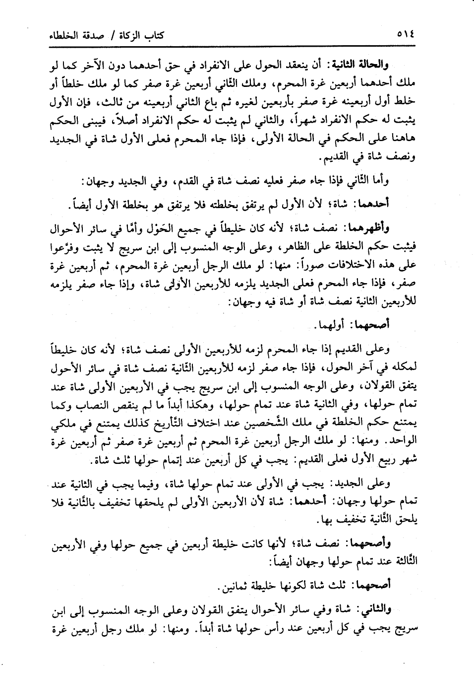 وعلى القديم إذا جاء المحرم لزمه للأربعين الأولى نصف شاة؛ لأنه كان خليطاً لمكله في آخر الحول، فإذا جاء صفر لزمه للأربعين الثّانية نصف شاة في سائر الأحول يتفق القولان، وعلى الوجه المنسوب إلى ابن سريج يجب في الأربعين الأولى شاة عند تمام حولها، وفي الثانية شاة عند تمام حولها، وهكذا أبداً ما لم ينقص النصاب وكما يمتنع حكم الخلطة في ملك الشَّخصين عند اختلاف التَّأريخ كذلك يمتنع في ملكي الواحد. ومنها: لو ملك الرجل أربعين غرة المحرم ثم أربعين غرة صفر ثم أربعين غرة شهر ربيع الأول فعلى القديم: يجب في كل أربعين عند إتمام حولها ثلث شاة.