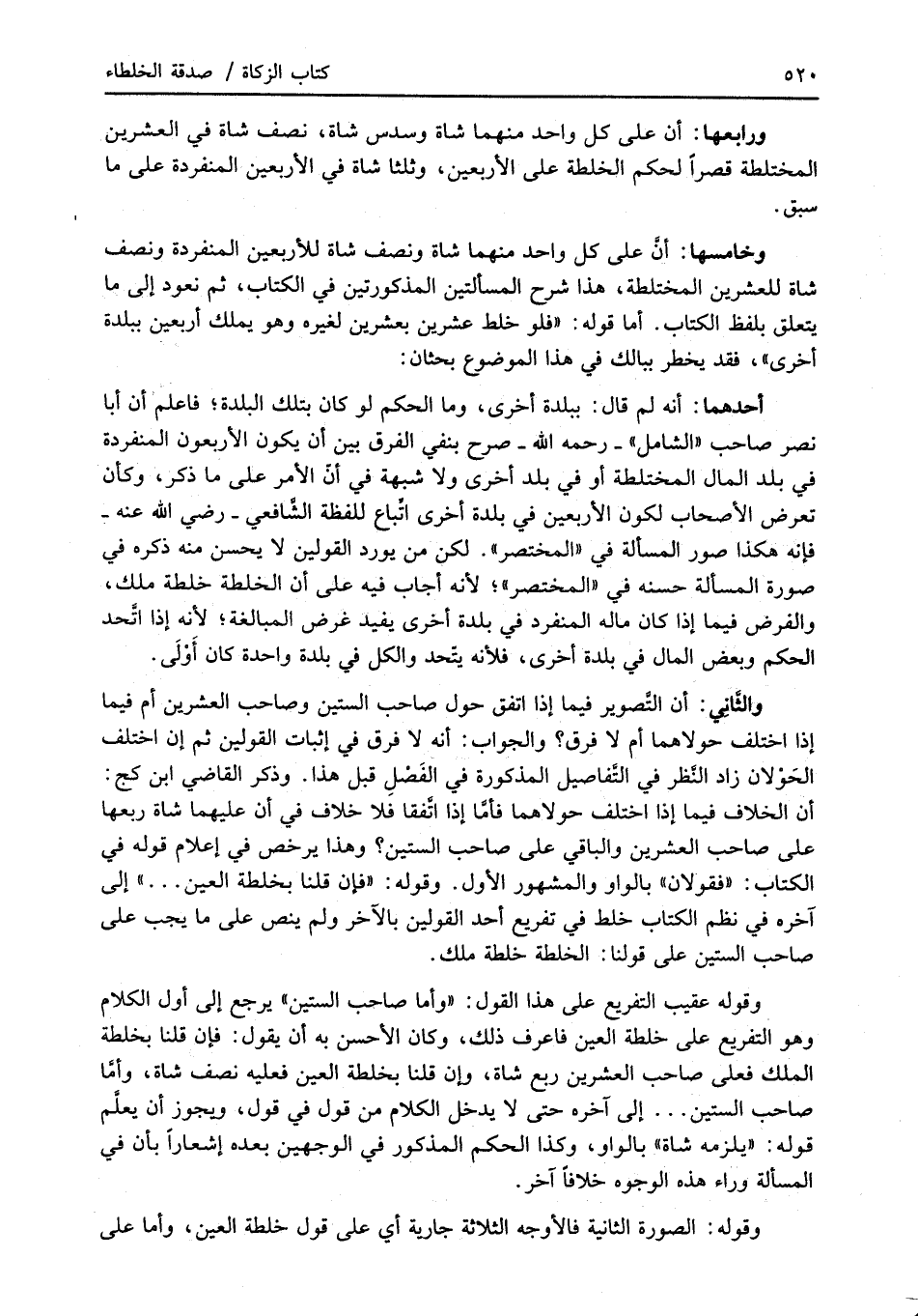 وخامسها: أنَّ على كل واحد منهما شاة ونصف شاة للأربعين المنفردة ونصف شاة للعشرين المختلطة، هذا شرح المسألتين المذكورتين في الكتاب، ثم نعود إلى ما يتعلق بلفظ الكتاب. أما قوله: "فلو خلط عشرين بعشرين لغيره وهو يملك أربعين ببلدة أخرى"، فقد يخطر ببالك في هذا الموضوع بحثان: