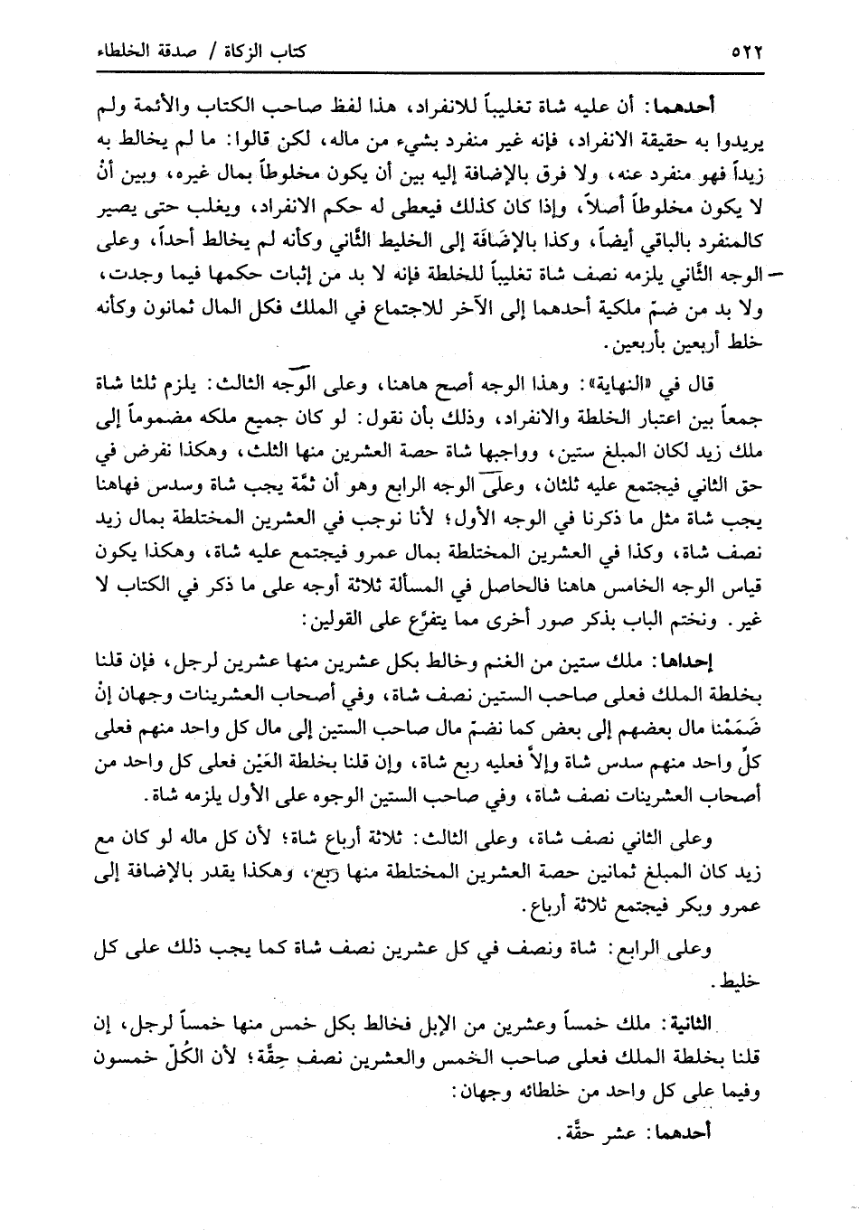 قال في "النهاية": وهذا الوجه أصح هاهنا، وعلى الوجه الثالث: يلزم ثلثا شاة جمعاً بين اعتبار الخلطة والانفراد، وذلك بأن نقول: لو كان جميع ملكه مضموماً إلى ملك زيد لكان المبلغ ستين، وواجبها شاة حصة العشرين منها الثلث، وهكذا نفرض في حق الثاني فيجتمع عليه ثلثان، وعلى الوجه الرابع وهو أن ثمَّة يجب شاة وسدس فهاهنا يجب شاة مثل ما ذكرنا في الوجه الأول؛ لأنا نوجب في العشرين المختلطة بمال زيد نصف شاة، وكذا في العشرين المختلطة بمال عمرو فيجتمع عليه شاة، وهكذا يكون قياس الوجه الخامس هاهنا فالحاصل في المسألة ثلاثة أوجه على ما ذكر في الكتاب لا غير. ونختم الباب بذكر صور أخرى مما يتفرَّع على القولين: