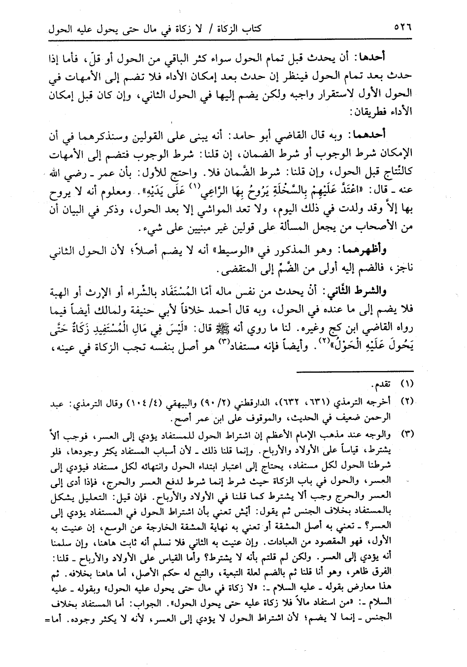 (¬3) والوجه عند مذهب الإمام الأعظم إن اشتراط الحول للمستفاد يؤدي إلى العسر، فوجب ألاَّ يشترط، قياساً على الأولاد والأرباح. وإنما قلنا ذلك -لأن أسباب المستفاد يكثر وجودها، فلو شرطنا الحول لكل مستفاد، يحتاج إلى اعتبار ابتداء الحول وانتهائه لكل مستفاد فيؤدي إلى العسر، والحول في باب الزكاة حيث شرط إنما شرط لدفع العسر والحرج، فإذا أدى إلى العسر والحرج وجب ألا يشترط كما قلنا في الأولاد والأرباح. فإن قيل: التعليل يشكل بالمستفاد بخلاف الجنس ثم يقول: أيْش تعني بأن اشتراط الحول في المستفاد يؤدي إلى العسر؟ - تعني به أصل المشقة أو تعني به نهاية المشقة الخارجة عن الوسع، إن عنيت به الأول، فهو المقصود من العبادات. وإن عنيت به الثاني فلا نسلم أنه ثابت هاهنا، وإن سلمنا أنه يؤدي إلى العسر. ولكن لم قلتم بأنه لا يشترط؟ وأما القياس على الأولاد والأرباح -قلنا: الفرق ظاهر، وهو أنا قلنا ثم بالضم لعلة التبعية، والتبع له حكم الأصل، أما هاهنا بخلافه. ثم هذا معارض بقوله -عليه السلام-: "لا زكاة في مال حق يحول عليه الحول" وبقوله -عليه السلام-: "من استفاد مالاً فلا زكاة عليه حق يحول الحول". الجواب: أما المستفاد بخلاف الجنس- إنما لا يضم؛ لأن اشتراط الحول لا يؤدي إلى العسر، لأنه لا يكثر وجوده. أما =