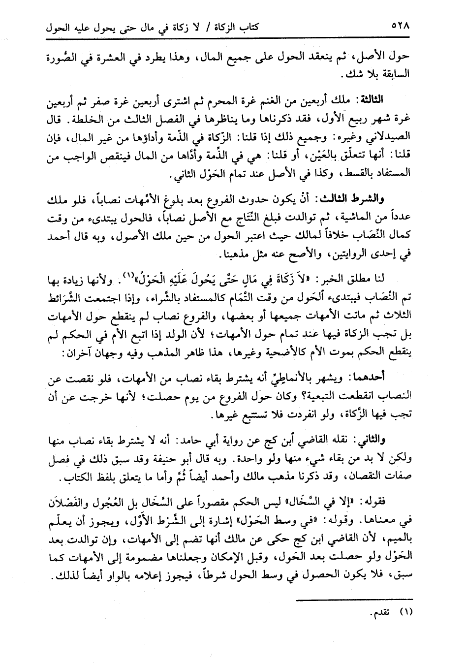 والشرط الثالث: أنْ يكون حدوث الفروع بعد بلوغ الأمَّهات نصاباً، فلو ملك عدداً من الماشية، ثم توالدت فبلغ النِّتَاج مع الأصل نصاباً، فالحول يبتدئ من وقت كمال النِّصَاب خلافاً لمالك حيث اعتبر الحول من حين ملك الأصول، وبه قال أحمد في إحدى الروايتين، والأصح عنه مثل مذهبنا.
