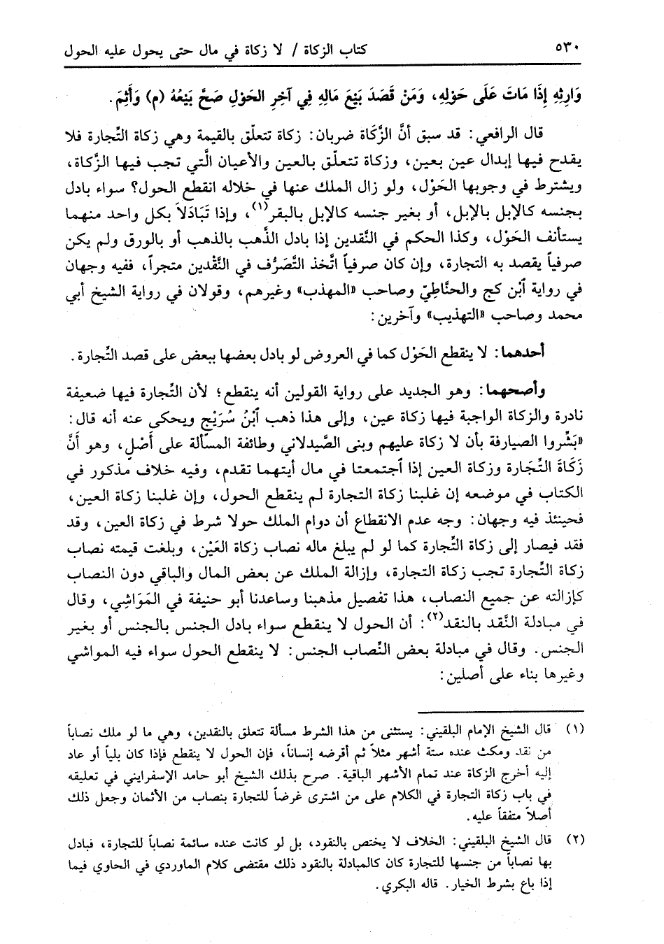 (¬2) قال الشيخ البلقيني: الخلاف لا يختص بالنقود، بل لو كانت عنده سائمة نصاباً للتجارة، فبادل بها نصاباً من جنسها للتجارة كان كالمبادلة بالنقود ذلك مقتض كلام الماوردي في الحاوي فيما إذا باع بشرط الخيار. قاله البكري.