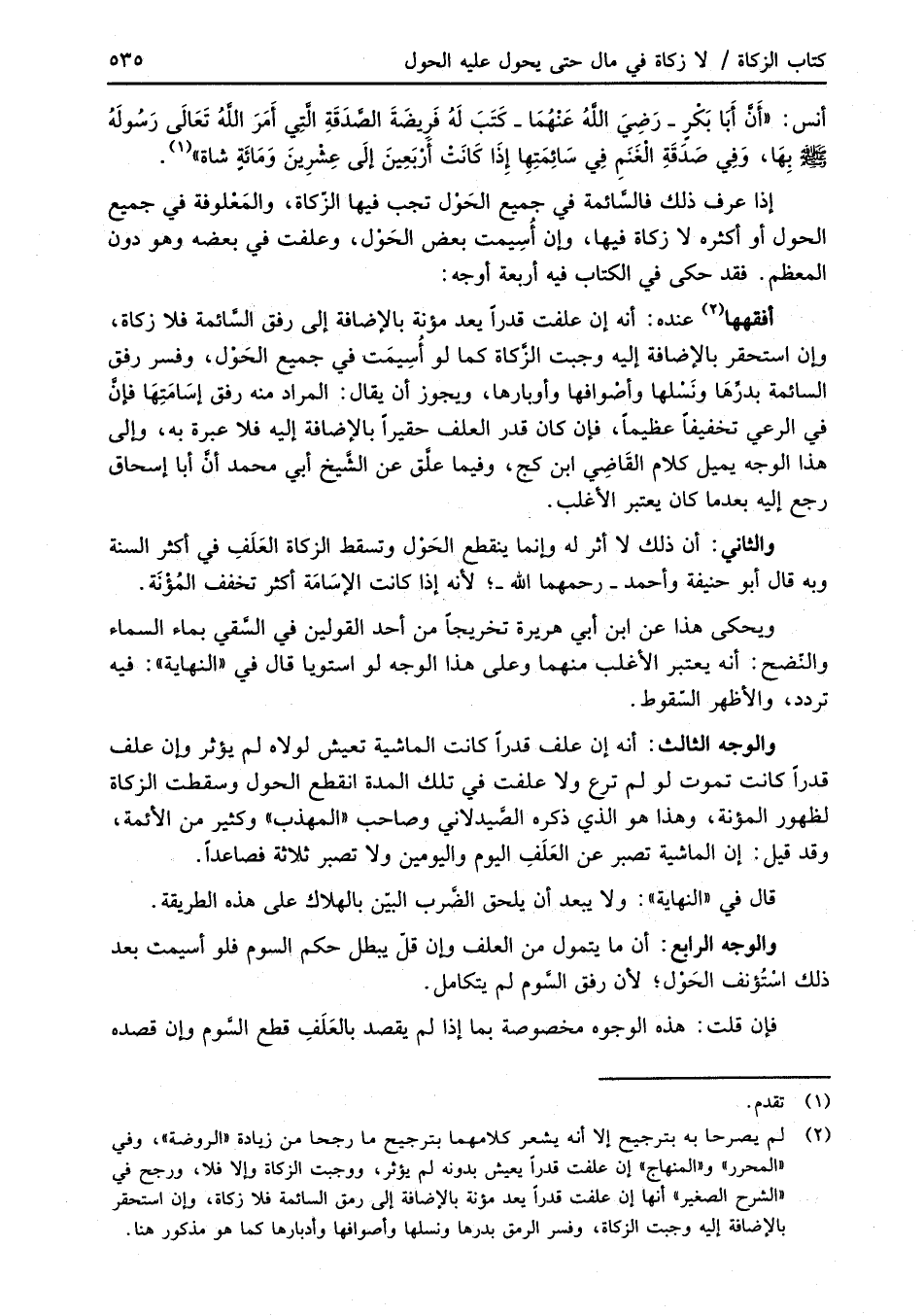 (¬2) لم يصرحا به بترجيح إلا أنه يشعر كلامهما بترجيح ما رجحا من زيادة "الروضة"، وفي "المحرر" و"المنهاج" إن علفت قدراً يعيش بدونه لم يؤثر، ووجبت الزكاة وإلا فلا، ورجح في "الشرح الصغير" أنها إن علفت قدراً يعد مؤنة بالإضافة إلى رمق السائمة فلا زكاة، وإن استحقر بالإضافة إليه وجبت الزكاة، وفسر الرمق بدرها ونسلها وأصوافها وأدبارها كما هو مذكور هنا.