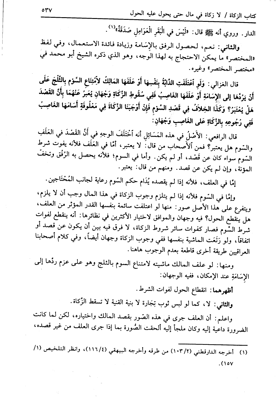 قال الغزالي: وَلَوِ اعْتَلَفَتِ الدَّابةُ بِنَفْسِهَا أَوْ عَلَفَهَا المَالِكُ لامْتِنَاعِ السَّوْم بِالثَّلْجَ عَلَى أَنْ يَرُدَّهَا إلى الإسَامَةِ أَوْ عَلَفَهَا الغَاصِبُ فَفِي سُقُوطِ الزَّكَاةِ وَجْهَانِ يُعَبرُ عَنْهُمَا بِأَنَّ القَصْدَ هَلْ يُعْتَبَر؟ وَكَذَا الخِلاَفُ فِي قَصْدِ السَّوْمِ فَإِنْ أَوْجَبَنَا الزَّكَاةَ فِي مَعْلُوفَةٍ أَسَامَهَا الغَاصِبُ فَفِي رُجُوعِهِ بِالزَّكاةِ عَلى الغَاصِبِ وَجْهَانِ:
