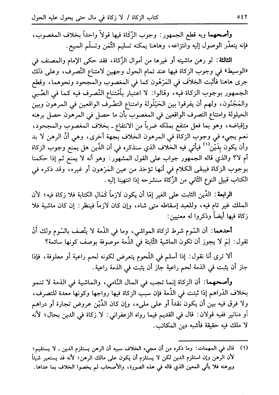 الثالثة: لو رهن ماشيته أو غيرها من أموال الزَّكاة، فقد حكى الإمام والمصنف في "الوسيط" في وجوب الزكاة فيها عند تمام الحول وجهين لامتناع التَّصرف، وعلى ذلك جرى هاهنا فأثبت الخِلاَف في المَرْهُون كما في المغصوب والمجحود ونحوهما، وقطع الجمهور بوجوب الزكاة فيه، وقالوا: لا اعتبار بامْتناع التَّصرف فيه كما في الصَّبي والمَجْنُون، ولهم أن يفرقوا بين الحَيْلُولة وامتناع التصَّرف الواقعين في المرهون وبين الحيلولة وامتناع التصرف الواقعين في المغصوب بأن ما حصل في المرهون حصل برهنه وإقباضه، وهو بما فعل متنفع بملكه ضرباً من الانتفاع - بخلاف المغصوب والمجحود، نعم يجيء في وجوب الزكاة في المرهون الخلاف بجهة أخرى، وهي أنَّ الرهن لا بد وأن يكون بِدَيْن (¬1) فيأتي فيه الخلاف الذي سنذكره في أن الدَّين هل يمنع وجوب الزكاة أم لا؟ والذي قاله الجمهور جواب على القول المشهور: وهو أنه لا يمنع ثم إذا حكمنا بوجوب الزكاة فيبقى الكلام في أنها تؤخذ من عين المَرْهون أو غيره، وقد ذكره في الكتاب قبيل النوع الثّاني من الزَّكاة سنشرحه إذا انتهينا إليه.
