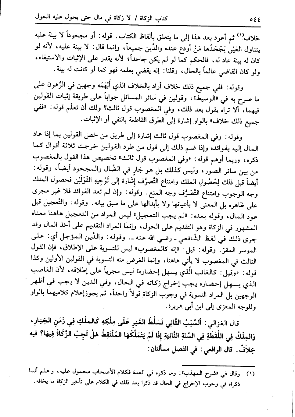 وقوله: وفي المغصوب قول ثالث إشارة إلى طريق من خص القولين بما إذا عاد المال إليه بفوائده وإذا ضم ذلك إلى قول من طرد القولين خرجت ثلاثة أقوال كما ذكره، وربما أوهم قوله: "وفي المغصوب قول ثالث" تخصيص هذا القول بالمغصوب من بين سائر الصور، وليس كذلك بل هو جَار في الضَّال والمجحود أيضاً، وقوله: أيضاً قبل ذلك لِحُصُولِ الملك وامتناع التَّصرُّف إِشَارة إلى تَوْجِيهِ القَوْلَيْن فحصول الملك وجه الوجوب وامتناع التَّصَرُّف وجه المنع. وقوله: وإن لم تعد الفوائد فلا غير مجرى على ظاهره بل المعنى لا بأعيانها ولا بأبدالها على ما سبق بيانه. وقوله: والتَّعجيل قبل عود المال، وقوله بعده: "لم يجب التعجيل" ليس المراد من التعجيل هاهنا معناه المشهور في الزكاة وهو التقديم على الحول، وإنما المراد التقديم على أخذ المال وقد جرى ذلك في لفظ الشافعي -رضي الله عنه-. وقوله: والدَّين المؤجل أي: على الموسر المقرّ. وقوله: قيل: "إنه كالمغصوب" ليس للتسوية على الإطلاق، فإن القول الثالث في المغصوب لا يأتي هاهنا، وإنما الغرض منه التسوية في القولين الأولين وكذا قوله: "وقيل: كالغائب الَّذي يسهل إحضاره" ليس مجرياً على إطلاقه، لأن الغاصب الذي يسهل إحضاره يجب إخراج زكاته في الحال، وفي الدين لا يجب في أظهر الوجهين بل المراد التسوية في وجوب الزكاة قولاً واحداً، ثم يجوز إعلام كلاميهما بالواو وللوجه المعزى إلى ابن أبي هريرة.