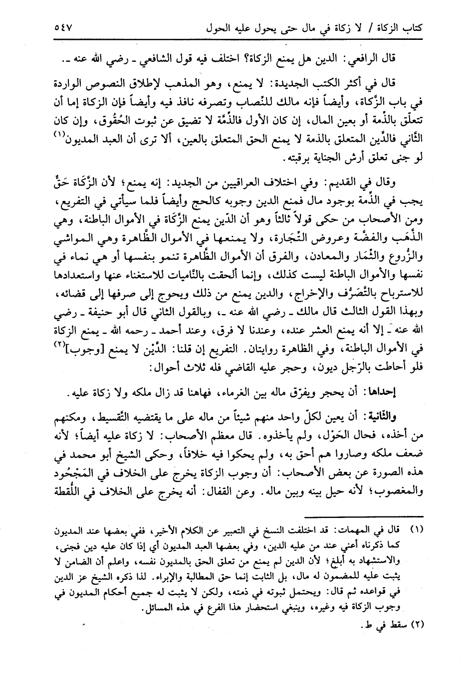 قال الرافعي: الدين هل يمنع الزكاة؟ اختلف فيه قول الشافعي -رضي الله عنه-.