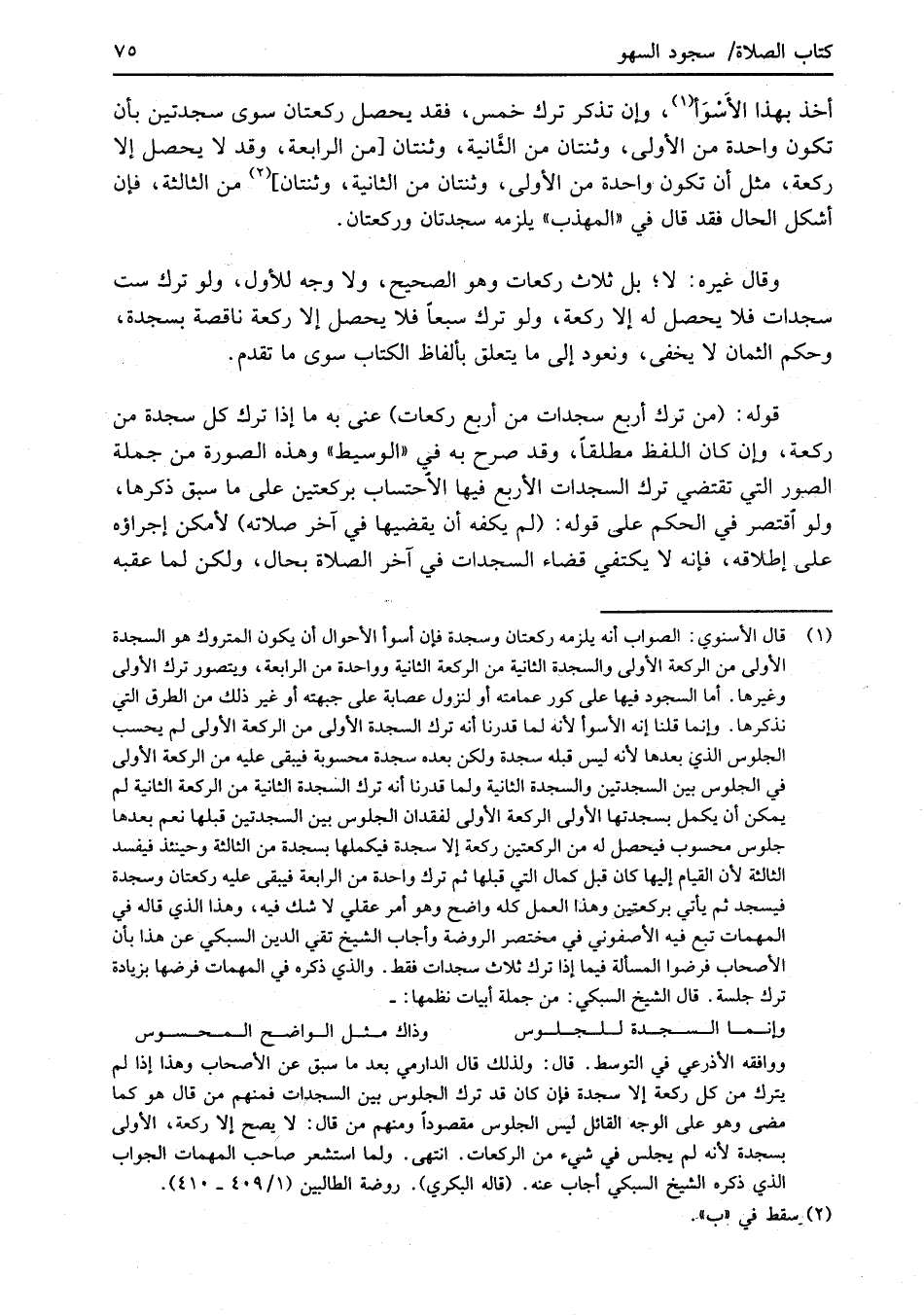 ووافقه الأذرعي في التوسط. قال: ولذلك قال الدارمي بعد ما سبق عن الأصحاب وهذا إذا لم يترك من كل ركعة إلا سجدة فإن كان قد ترك الجلوس بين السجدات فمنهم من قال هو كما مضى وهو على الوجه القائل ليس الجلوس مقصوداً ومنهم من قال: لا يصح إلا ركعة، الأولى بسجدة لأنه لم يجلس في شيء من الركعات. انتهى. ولما استشعر صاحب المهمات الجواب الذي ذكره الشيخ السبكي أجاب عنه. (قاله البكري). روضة الطالبين (1/ 409 - 410).