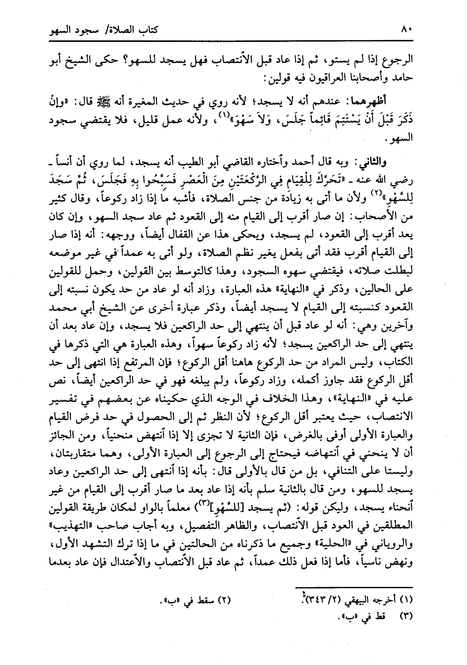 والثاني: وبه قال أحمد واختاره القاضي أبو الطيب أنه يسجد، لما روي أن أنساً - رضي الله عنه- "تَحَرَّكَ لِلْقِيَامِ فِي الرَّكْعَتَيْنِ مِنَ الْعَصْرِ فَسَبَّحُوا بِهِ فَجَلَسَ، ثُمَّ سَجَدَ لِلسَّهْوِ" (¬2) ولأن ما أتى به زيادة من جنس الصلاة، فأشبه ما إذا زاد ركوعاً، وقال كثير من الأصحاب: إن صار أقرب إلى القيام منه إلى القعود ثم عاد سجد السهو، وإن كان يعد أقرب إلى القعود، لم يسجد، ويحكى هذا عن القفال أيضاً، ووجهه: أنه إذا صار إلى القيام أقرب فقد أتى بفعل يغير نظم الصلاة، ولو أتى به عمداً في غير موضعه لبطلت صلاته، فيقتضي سهوه السجود، وهذا كالتوسط بين القولين، وحمل للقولين على الحالين، وذكر في "النهاية" هذه العبارة، وزاد أنه لو عاد من حد يكون نسبته إلى القعود كنسبته إلى القيام لا يسجد أيضاً، وذكر عبارة أخرى عن الشيخ أبي محمد وآخرين وهي: أنه لو عاد قبل أن ينتهي إلى حد الراكعين فلا يسجد، وإن عاد بعد أن ينتهي إلى حد الراكعين يسجد؛ لأنه زاد ركوعاً سهواً، وهذه العبارة هي التي ذكرها في الكتاب، وليس المراد من حد الركوع هاهنا أقل الركوع؛ فإن المرتفع إذا انتهى إلى حد أقل الركوع فقد جاوز أكمله، وزاد ركوعاً، ولم يبلغه فهو في حد الراكعين أيضاً، نص عليه في "النهاية"، وهذا الخلاف في الوجه الذي حكيناه عن بعضهم في تفسير الانتصاب، حيث يعتبر أقل الركوع؛ لأن النظر ثم إلى الحصول في حد فرض القيام والعبارة الأولى أوفى بالغرض، فإن الثانية لا تجزى إلا إذا انتهض منحنياً، ومن الجائز أن لا ينحني في انتهاضه فيحتاج إلى الرجوع إلى العبارة الأولى، وهما متقاربتان، وليستا على التنافي، بل من قال بالأولى قال: بأنه إذا انتهى إلى حد الراكعين وعاد يسجد للسهو، ومن قال بالثانية سلم بأنه إذا عاد بعد ما صار أقرب إلى القيام من غير انحناء يسجد، وليكن قوله: (ثم يسجد [للسَّهْوِ] (¬3)) معلماً بالواو لمكان طريقة القولين المطلقين في العود قبل الانتصاب، والظاهر التفصيل، وبه أجاب صاحب "التهذيب" والروياني في "الحلية" وجميع ما ذكرناه من الحالتين في ما إذا ترك التشهد الأول، ونهض ناسياً، فأما إذا فعل ذلك عمداً، ثم عاد قبل الانتصاب والاعتدال فإن عاد بعدما