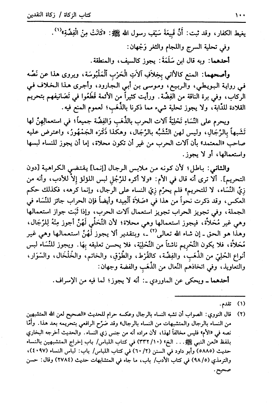 (¬2) قال النووي: الصواب أن تشبه النساء بالرجال وعكسه حرام للحديث "الصحيح لعن الله المتشبهين من النساء بالرجال والمتشبهات من النساء بالرجال" وقد صَرَّح الرافعي بتحريمه بعد هذا. وأَمَّا نصه في "الأم" فليس مخالفاً لهذا، لأن مراده أنه من جنس زي النساء. والحديث أخرجه البخاري بلفظ "لعن النبي -صلى الله عليه وسلم- ... الخ" (10/ 332) في كتاب اللباس/ باب إخراج المتشبهين بالنساء حديث (5885) وأبو داود في السنن (2/ 60) في كتاب اللباس/ باب: لباس النساء (4097)، والترمذي (5/ 98) في كتاب الأدب/ باب، ما جاء في المتشابهات حديث (2784) وقال: حسن صحيح.