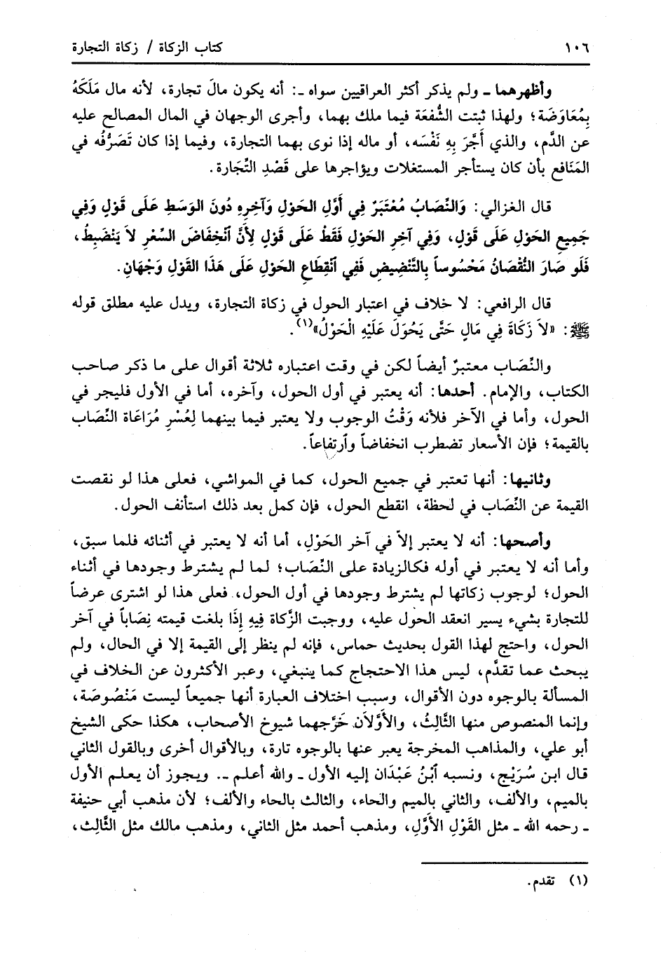 قال الغزالي: وَالنِّصَابُ مُعْتَبَرٌ فِي أَوَّلِ الحَوْلِ وَآخِرِهِ دُونَ الوَسَطِ عَلَى قَوْلٍ وَفي جَمِيعِ الحَوْلِ عَلَى قَوْلٍ، وَفي آخِرِ الحَوْلِ فَقَطْ عَلَى قَوْلٍ لِأَنَّ انْخِفَاضَ السِّعْرِ لاَ يَنْضَبِطُ، فَلَو صَارَ النُّقْصَانُ مَحْسُوساً بِالتَّنْضِيضِ فَفِي انْقِطَاعِ الحَوْلِ عَلَى هَذَا القَوْلِ وَجْهَانِ.