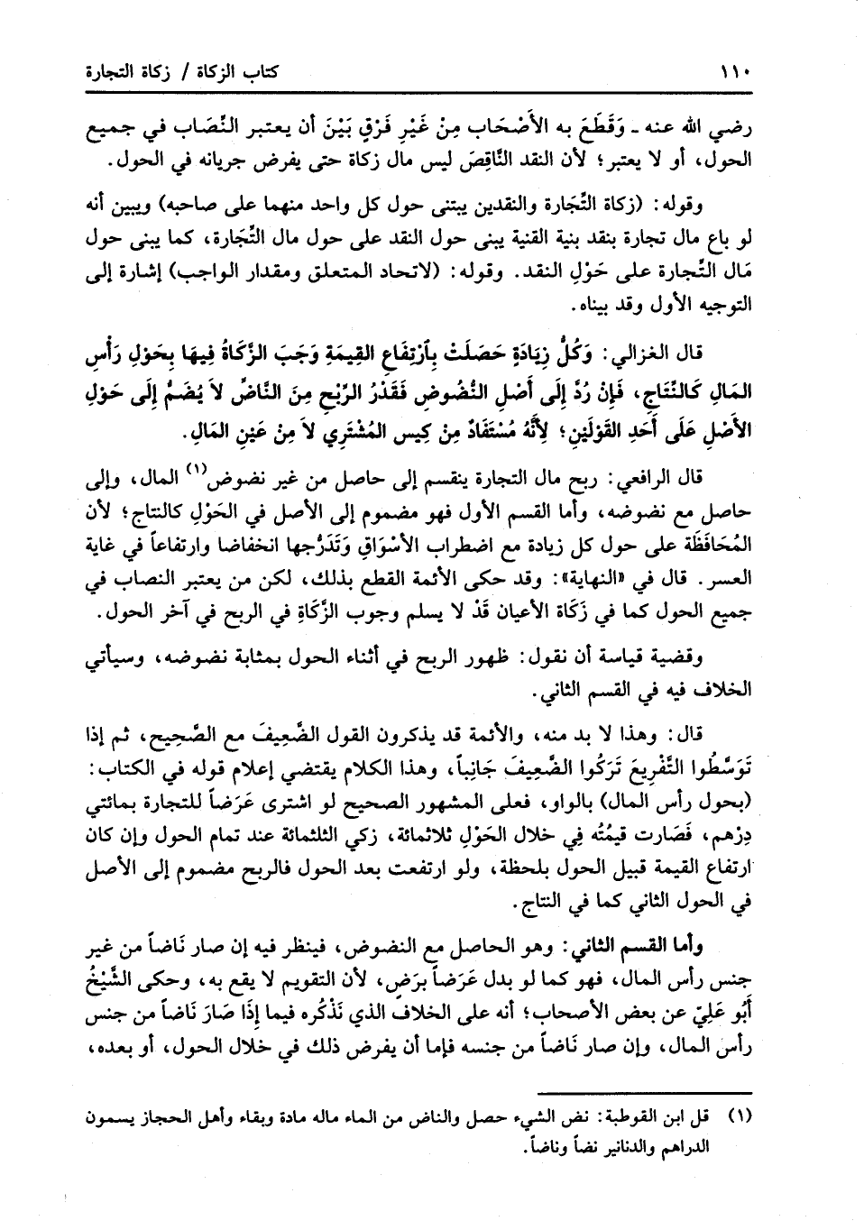 قال الرافعي: ربح مال التجارة ينقسم إلى حاصل من غير نضوض (¬1) المال، إلى حاصل مع نضوضه، وأما القسم الأول فهو مضموم إلى الأصل في الحَوْلِ كالنتاج؛ لأن المُحَافَظَة على حول كل زيادة مع اضطراب الأسْوَاقِ وَتَدَرُّجها انخفاضا وارتفاعاً في غاية العسر. قال في "النهاية": وقد حكى الأئمة القطع بذلك، لكن من يعتبر النصاب في جميع الحول كما في زَكَاة الأعيان قَدْ لا يسلم وجوب الزَّكَاةِ في الربح في آخر الحول.