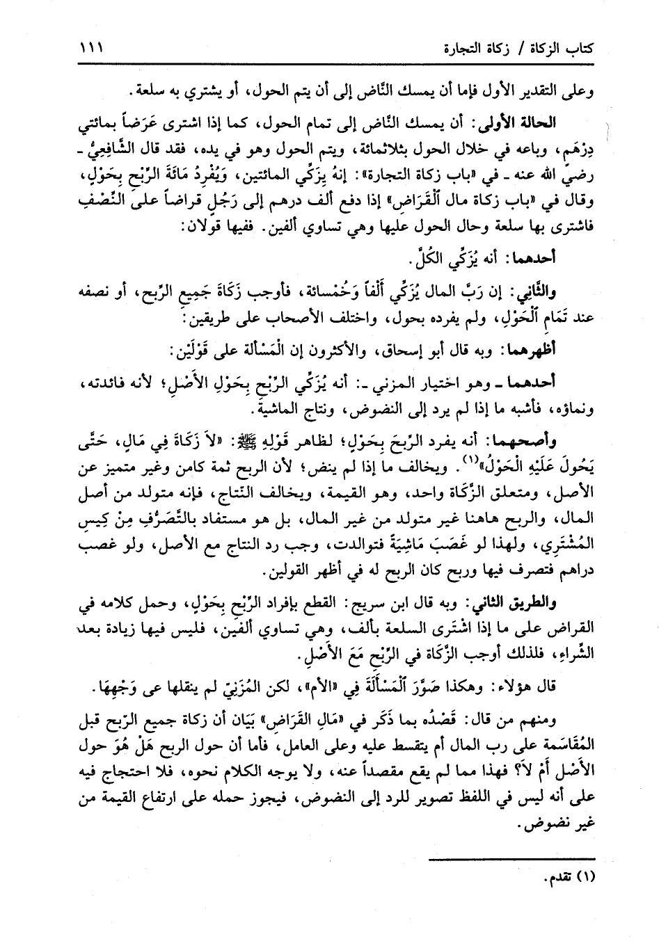 الحالة الأولى: أن يمسك النَّاض إلى تمام الحول، كما إذا اشترى عَرَضًا بمائتي دِرْهَمٍ، وباعه في خلال الحول بثلاثمائة، ويتم الحول وهو في يده، فقد قال الشَّافِعِيُّ - رضي الله عنه- في "باب زكاة التجارة": إنهُ يِزَكِّي المائتين، وَيُفْرِدُ مَائَةَ الرِّبْحِ بِحَوْلٍ، وقال في "باب زكاة مال الْقَرَاضِ" إذا دفع ألف درهم إلى رَجُلِ قراضاً على النِّصْفِ فاشترى بها سلعة وحال الحول عليها وهي تساوي ألفين. ففيها قولان: