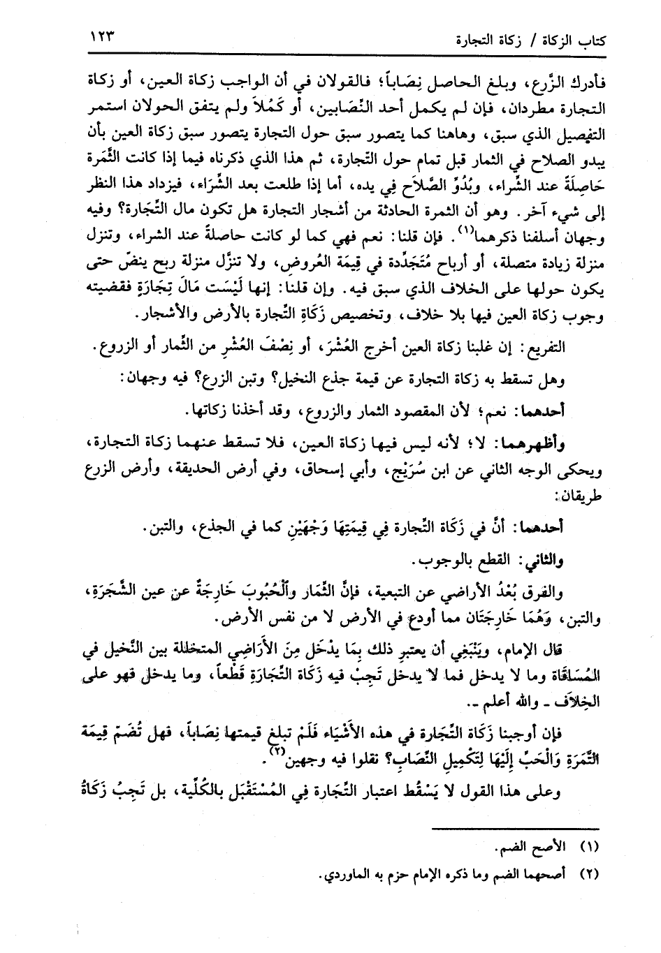 فأدرك الزَّرع، وبلغ الحاصل نِصَاباً؛ فالقولان في أن الواجب زكاة العين، أو زكاة التجارة مطردان، فإن لم يكمل أحد النِّصَابين، أو كَمُلاَ ولم يتفق الحولان استمر التفصيل الذي سبق، وهاهنا كما يتصور سبق حول التجارة يتصور سبق زكاة العين بأن يبدو الصلاح في الثمار قبل تمام حول التّجارة، ثم هذا الذي ذكرناه فيما إذا كانت الثَّمَرة حَاصِلَة عند الشِّراء، وبُدُوِّ الصَّلاَح فِي يده، أما إذا طلعت بعد الشِّرَاء، فيزداد هذا النظر إلى شيء آخر. وهو أن الثمرة الحادثة من أشجار التجارة هل تكون مال التِّجَارة؟ وفيه وجهان أسلفنا ذكرهما (¬1). فإن قلنا: نعم فهي كما لو كانت حاصلة عند الشراء، وتنزل منزلة زيادة متصلة، أو أرباح مُتَجَدِّدة في قِيمَة العُروضِ، ولا تنزَّل منزلة ربح ينضّ حتى يكون حولها على الخلاف الذي سبق فيه. وإن قلنا: إنها لَيْسَت مَالَ تِجَارَةٍ فقضيته وجوب زكاة العين فيها بلا خلاف، وتخصيص زَكَاةِ التِّجارة بالأرض والأشجار.
