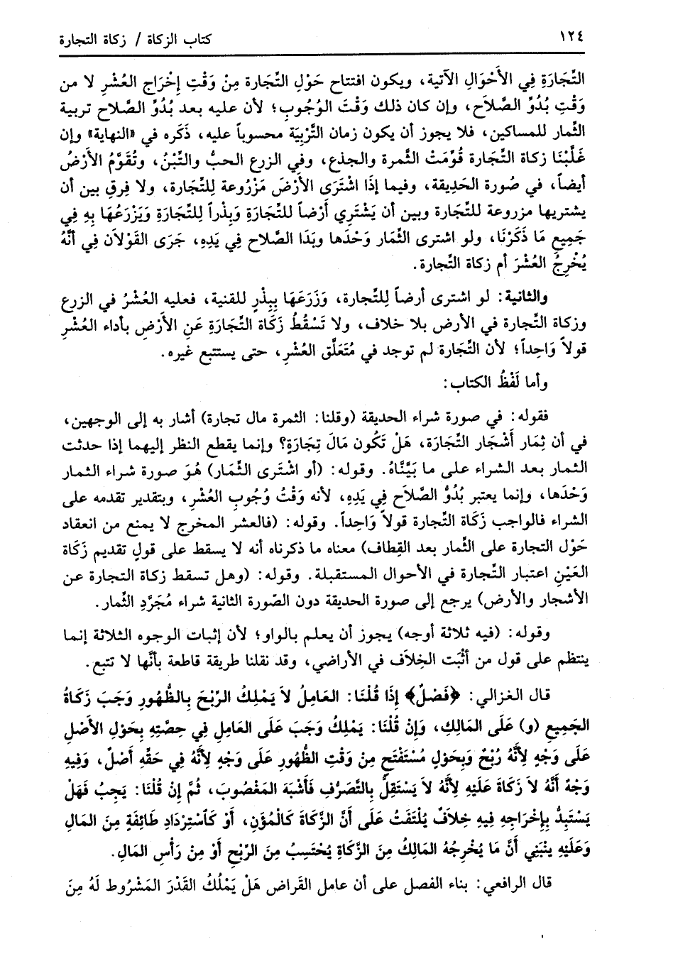 قال الغزالي: {فَصْلٌ} إِذَا قُلنَا: العَامِلُ لاَ يَمْلِكُ الرِّبْحَ بِالظُّهُورِ وَجَبَ زَكَاةُ الجَمِيعِ (و) عَلَى المَالِكِ، وَإِنْ قُلْنَا: يَمْلِكُ وَجَبَ عَلَى العَامِلِ فِي حِصَّتِهِ بِحَوْلِ الأَصْلِ عَلَى وَجْهٍ لِأنَّهُ رُبْحٌ وَبِحَوْلٍ مُسْتَفْتَحٍ مِنْ وَقْتِ الظُّهُورِ عَلَى وَجْهٍ لِأنَّهُ فِي حَقِّهِ أَصْلٌ، وَفِيهٍ وَجْهٌ أَنَّهُ لاَ زَكَاةَ عَلَيْهِ لِأَنَّهُ لاَ يَسْتَقِلُّ بِالتَّصَرُّفِ فَأَشْبَهَ المَغْصُوبَ، ثُمَّ إِنْ قُلْنَا: يَجِبُ فَهَلْ يَسْتبِدُّ بِإخْرَاجِهِ فِيهِ خِلاَفٌ يُلْتَفَتُ عَلَى أَنَّ الزَّكَاةَ كالْمُؤَنِ، أَوْ كَاسْتِرْدَادِ طَائِفَةٍ مِنَ المَالِ وَعَلَيهِ ينْبَني أَنَّ مَا يُخْرِجُهُ المَالِكُ مِنَ الزَّكَاةِ يُحْتَسِبُ مِنَ الرِّبْحِ أَوْ مِنْ رَأسِ المَالِ.