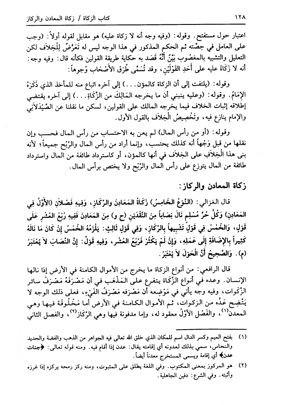 قال الغزالي: (النَّوْعُ الخَامِسُ) زَكَاةُ المَعَادِنَ والرِّكَازِ، وَفِيهِ فَصْلاَنِ (الأَوَّلُ فِي المَعَادِنِ) وَكُلُّ حُرٌ مُسْلِم نَالَ نِصَاباً مِنَ النَّقْدَيْنِ (ح و) مِنَ المَعَادِنَ فَفِيهِ رُبْعُ العُشْرِ عَلَى قَوْلٍ، وَالخُمْسُ فِي قَوْلٍ تَشْبِيهاً بِالرِّكَازِ، وَفِي قَوْلٍ ثَالِثٍ: يَلْزَمة الخُمْسُ إِنْ كَانَ مَا نَالَهُ كَثِيراً بِالاِضَافَةِ إِلَى عَمَلِهِ، وَإِنْ لَمْ يَكْثُرُ فَرُبْعُ العُشْر، وَفِيهِ قَوْلٌ: إِنَّ النِّصَابَ لاَ يُعْتَبَرُ (م). وَالصَّحِيحُ أَنَّ الْحَولَ لاَ يُعْتَبَرُ.