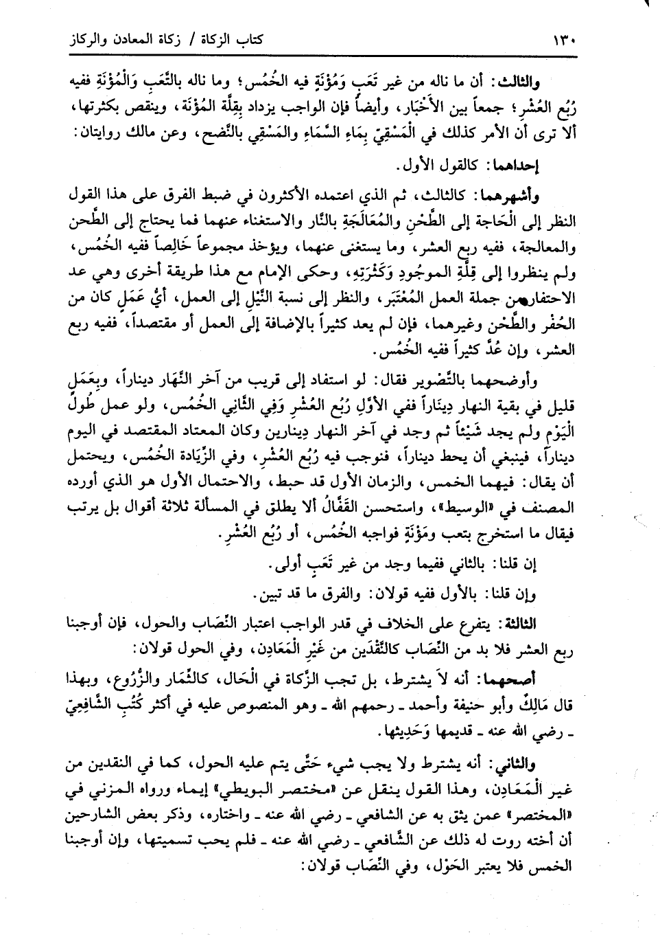 وأشهرهما: كالثالث، ثم الذي اعتمده الأكثرون في ضبط الفرق على هذا القول النظر إلى الْحَاجة إلى الطَّحْنِ والمُعَالَجَةِ بالنَّار والاستغناء عنهما فما يحتاج إلى الطَّحن والمعالجة، ففيه ربع العشر، وما يستغنى عنهما، ويؤخذ مجموعاً خَالِصاً ففيه الخُمُس، ولم ينظروا إلى قِلَّةِ الموجُودِ وَكَثْرَتِهِ، وحكى الإمام مع هذا طريقة أخرى وهي عد الاحتفار من جملة العمل المُعْتَبَر، والنظر إلى نسبة النَّيْلِ إلى العمل، أيُّ عَمَلٍ كان من الحُفْر والطَّحْن وغيرهما، فإن لم يعد كثيراً بالإضافة إلى العمل أو مقتصداً، ففيه ربع العشر، وإن عُدَّ كثيراً ففيه الخُمُس.