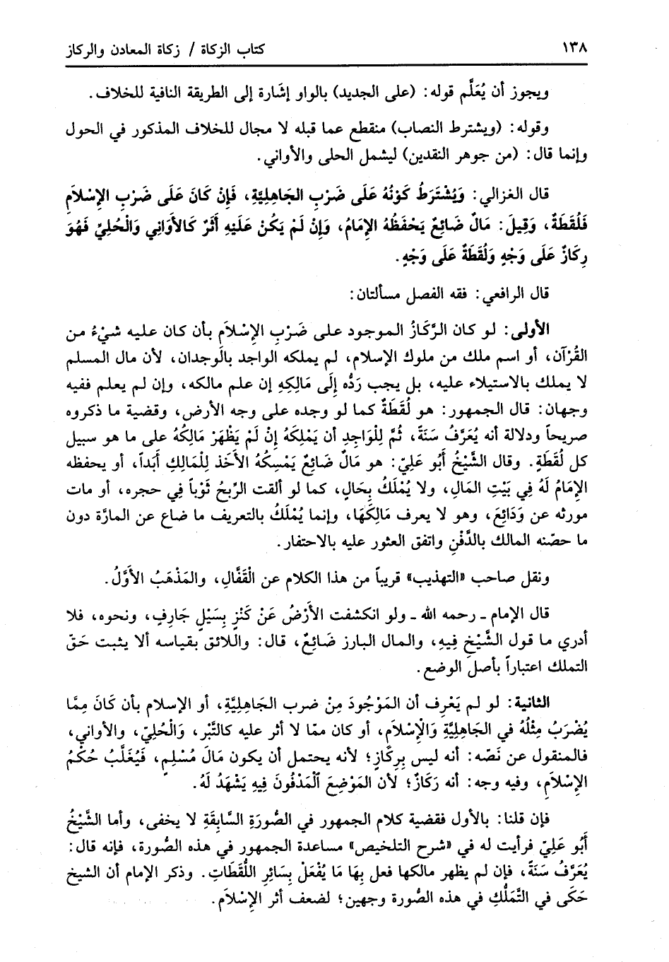 قال الغزالي: ويُشْتَرَطُ كَوْنُهُ عَلَى ضَرْبِ الجَاهِلِيَّةِ، فَإِنْ كَانَ عَلَى ضَرْبِ الإسْلاَمِ فَلُقَطَةٌ، وَقِيلَ: مَالٌ ضَائِعٌ يَحْفَظُهُ الإمَامُ، وَإِنْ لَمْ يَكُنْ عَلَيْهِ أَثَرٌ كَالأَوَانِي وَالْحُلِيِّ فَهُوَ رِكَازٌ عَلَى وَجْهٍ وَلُقَطَةٌ عَلَى وَجْهٍ.