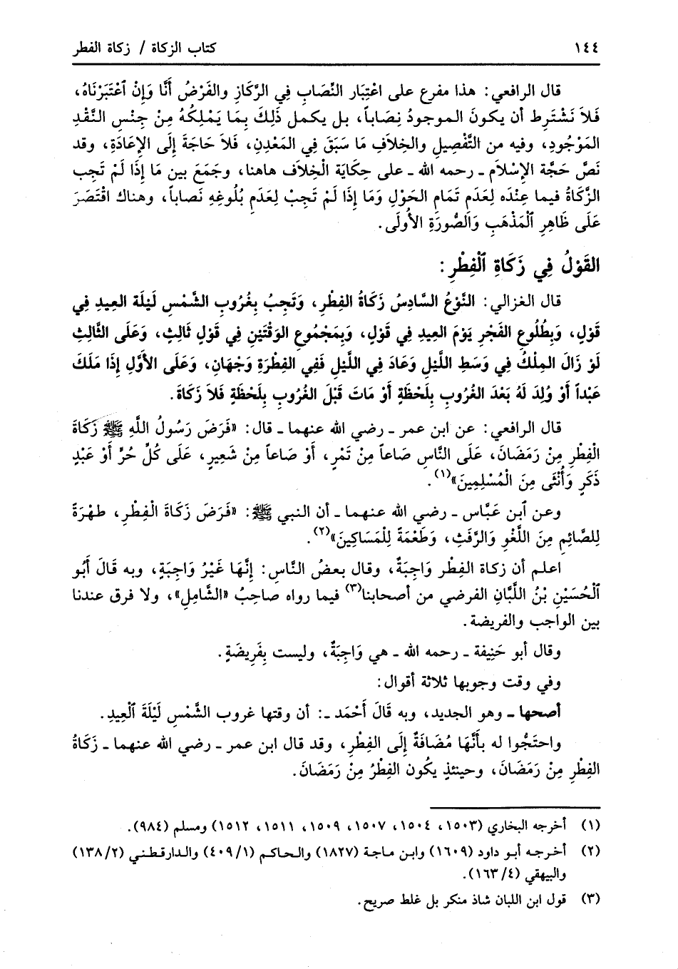 قال الرافعي: عن ابن عمر -رضي الله عنهما- قال: "فَرَضَ رَسُولُ اللهِ -صلى الله عليه وسلم- زَكَاةَ الْفِطْرِ مِنْ رَمَضَانَ، عَلَى النَّاسِ صَاعاً مِنْ تَمْرٍ، أَوْ صَاعاً مِنْ شَعِيرٍ، عَلَى كُلِّ حُرٍّ أَوْ عَبْدٍ ذَكَرٍ وَأُنْثَى مِنَ الْمُسْلِمِينَ" (¬1).