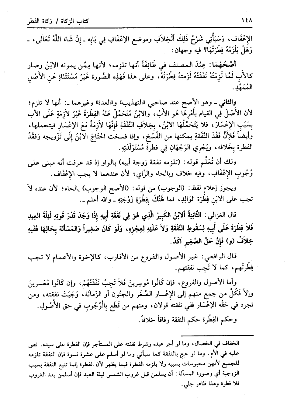 قال الغزالي: الثَّانِيَةُ الابْنُ الكَبِيرُ الَّذِي هُوَ فِي نَفَقَةِ أَبِيهِ إِذَا وَجَدَ قَدْرَ قُوتهِ لَيْلَةَ العِيدِ فَلاَ فِطْرَةَ عَلَى أَبِيهِ لِسُقُوطِ النَّفَقَةِ وَلاَ عَلَيْهِ لِعِجْزِهِ، وَلَوْ كَانَ صَغِيراً وَالمَسْألة بِحَالِهَا فَفَيهِ خِلاَفٌ (و) فَإِنَّ حَقَّ الصَّغِيرِ آكَدُ.