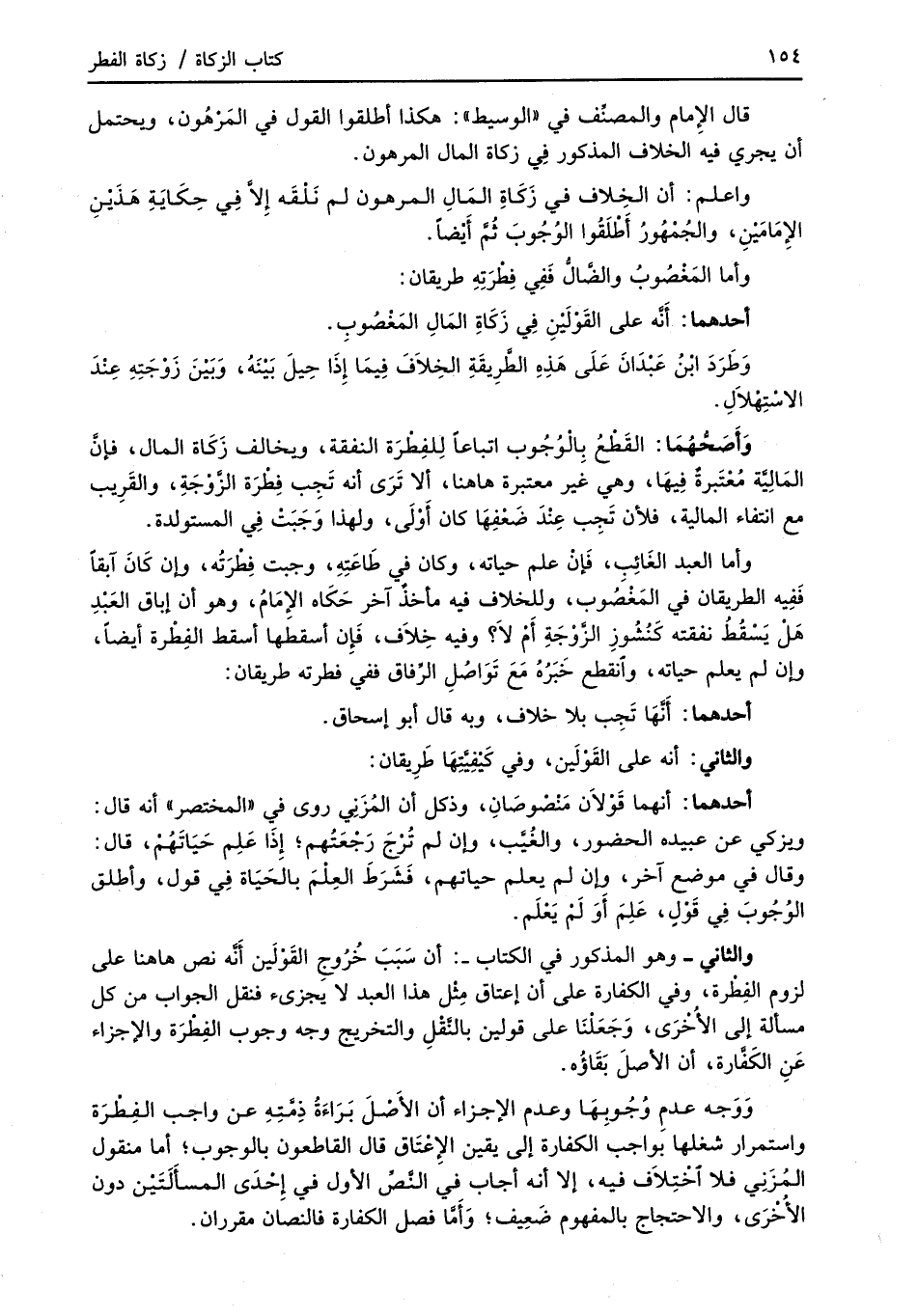 وَوَجه عدمِ وُجُوبِهَا وعدم الإجزاء أن الأَصْلَ بَرَاءَةُ ذِمَّتِهِ عن واجب الفِطْرَة واستمرار شغلها بواجب الكفارة إلى يقين الإِعْتَاق قال القاطعون بالوجوب؛ أما منقول المُزَنِي فلا اخْتِلاَف فيه، إلا أنه أجاب في النَّصِّ الأول في إِحْدَى المسأَلَتَيْن دون الأُخْرَى، والاحتجاج بالمفهوم ضَعِيف؛ وَأَمَّا فصل الكفارة فالنصان مقرران.