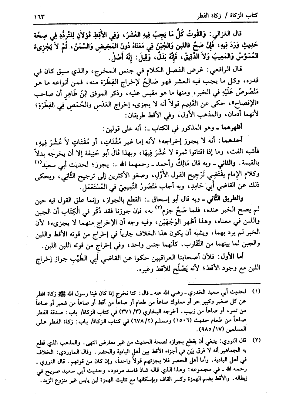 (¬2) قال النووي: ينبغي أن يقطع بجوازه لصحة الحديث من غير معارض انتهى. والمذهب الذي قطع به الجماهير أنه لا فرق بيّن في أجزاء الأقط بين أهل البادية والحضر. وقال الماوردي: الخلاف في أهل البادية. وأما أهل الحضر فلا يجزئهم قولاً واحداً، وإن كان من قوتهم. قال النووي -رحمه الله- في مجموعه: وهذا الذي قاله شاذ فاسد مردود، وحديث أبي سعيد صريح في إبطاله. والأقط بضم الهمزة وكسر القاف وبإسكانها مع تثليث الهمزة لبن يابس غير منزوع الزبد.