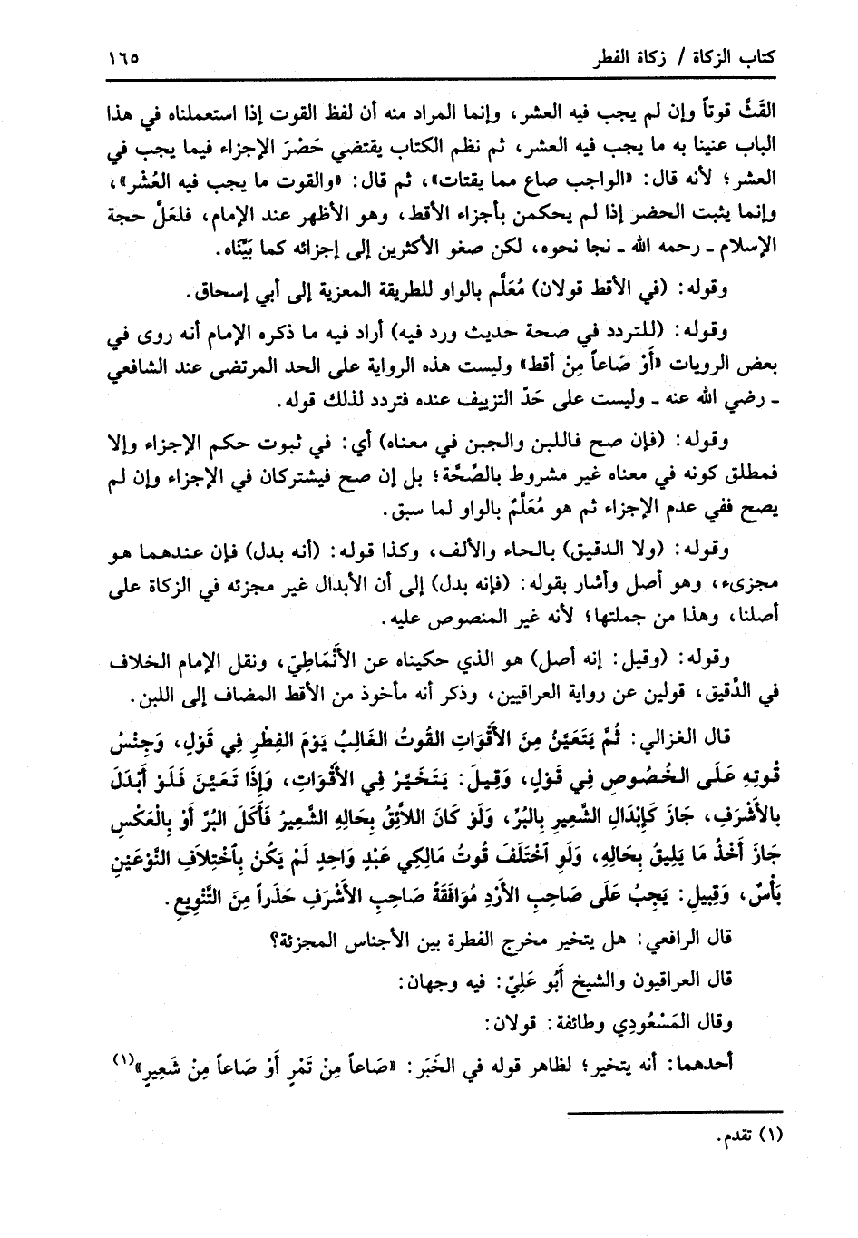 قال الغزالي: ثُمَّ يَتَعَيَّنُ مِنَ الأَقْوَاتِ القُوتُ الغَالِبُ يَومَ الفِطْرِ فِي قَوْلٍ، وَجِنْسُ قُوتِهِ عَلَى الخُصُوصِ فِي قَوُلٍ، وَقِيلَ: يَتَخَيَّرُ فِي الأَقْوَاتِ، وَإذَا تَعَيَّنَ فَلَوْ أَبْدَلَ بالأَشْرَفِ، جَازَ كَإبْدَالِ الشَّعِيرِ بِالبُرِّ، وَلَوْ كَانَ اللاَّئِقُ بِحَالِهِ الشَّعِيرُ فَأَكَلَ البُرَّ أَوْ بِالْعَكْسِ جَازَ أَخْذُ مَا يَلِيقُ بِحَالِهِ، وَلَوِ اخْتَلَفَ قُوتُ مَالِكِي عَبْدٍ وَاحِدٍ لَمْ يَكُنْ بِاخْتِلاَفِ النَّوْعَيْنِ بَأْسٌ، وَقِبيلِ: يَجِبُ عَلَى صَاحِبِ الأرْدِ مُوَافَقَةُ صَاحِبِ الأَشْرَفِ حَذَراً مِنَ التَّنْوِيعِ.