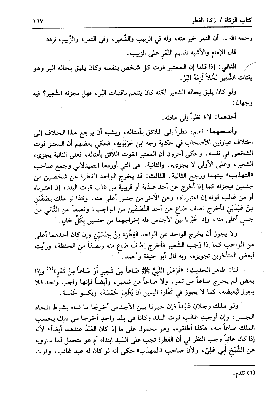 وأصحهما: نعم؛ نظراً إلى اللائق بأمثاله، ويشبه أن يرجع هذا الخلاف إلى اختلاف عبارتين للأصحاب في حكاية وجه ابن حَرْبَوَيهِ، فحكي بعضهم أن المعتبر قوت الشخص في نفسه. وحكى آخرون أن المعتبر القوت اللائق بأمثاله، فعلى الثانية يجزئ الشعير، وعلى الأولى لا يجزئ. والثانية: هي التي أوردها الصيدلاني وجمع صاحب "التهذيب" بينهما ورجح الثانية. الثالث: قد يخرج الواحد الفطرة عن شخصين من جنسين فيجزئه كما إذا أخرج عن أحد عبدَيْه أو قريبية من غلب قوت البلد، إن اعتبرناه أو من غالب قوته إن اعتبرناه، وعن الآخر من جنس أعلى منه، وكذا لو ملك نِصْفَيْنِ مِنْ عَبْدَيْنِ فأخرج نصف صَاعٍ عن أحد النِّصْفَين من الواجب، ونصفاً عن الثَّاني من جنس أعلى منه، وإذا خَبَّرنا بين الأجناس فله إخراجهما من جنسين بِكُلِّ حَالٍ.