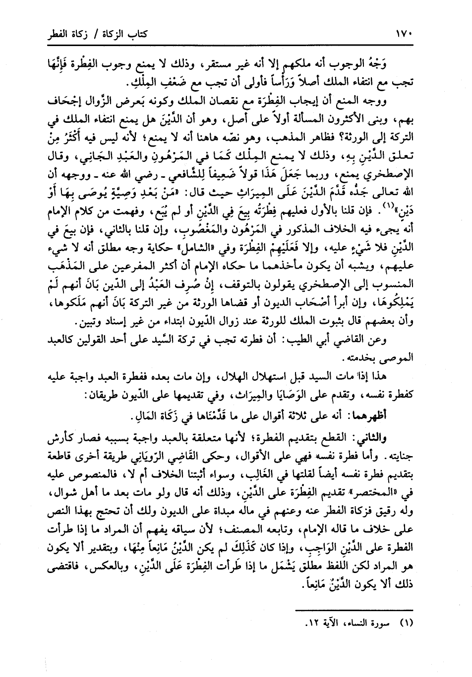 ووجه المنع أن إيجاب الفِطْرَة مع نقصان الملك وكونه بَعرض الزَّوال إجْحَاف بهم، وبنى الأكثرون المسألة أولاً على أصل، وهو أن الدَّيْنَ هل يمنع انتفاء الملك في التركة إلى الورثة؟ فظاهر المذهب، وهو نصّه هاهنا أنه لا يمنع؛ لأنه ليس فيه أكْثَرُ مِنْ تعلق الدَّيْنِ بِهِ، وذلك لا يمنع المِلْك كَمَا في المَرْهُونِ والعَبْدِ الجَانِي، وقال الإصطخري يمنع، وربما جَعَلَ هَذَا قولاً ضَعِيفاً لِلشَّافعي -رضي الله عنه- ووجهه أن الله تعالى جَدُّه قَدَّمَ الدَّيْنَ عَلَى المِيرَاثِ حيث قال: "مَنْ بَعْدِ وَصِيَّةٍ يُوصَى بِهَا أَوْ دَيْنٍ" (¬1). فإن قلنا بالأول فعليهم فِطْرَتُه بِيعَ فِي الدَّيْنِ أو لم يُبَع، وفهمت من كلام الإمام أنه يجئ فيه الخلاف المذكور في المَرْهُون والمَغْصُوب، وإن قلنا بالثاني، فإن بيعَ في الدَّيْنِ فلا شَيْءٍ عليه، وإلا فَعَلَيْهِمْ الفِطْرَة وفي "الشامل" حكاية وجه مطلق أنه لا شيء عليهم، ويشبه أن يكون مأخذهما ما حكاه الإمام أن أكثر المفرعين على المَذْهَب المنسوب إلى الإصطخري يقولون بالتوقف، إِنْ صُرِف العَبْدُ إلى الدّين بَانَ أنهم لَمْ يَمْلِكُوهَا، وإن أبرأ أصْحَاب الديون أو قضاها الورثة من غير التركة بَانَ أنهم مَلَكوها، وأن بعضهم قال بثبوت الملك للورثة عند زوال الدّيون ابتداء من غير إسناد وتبين.