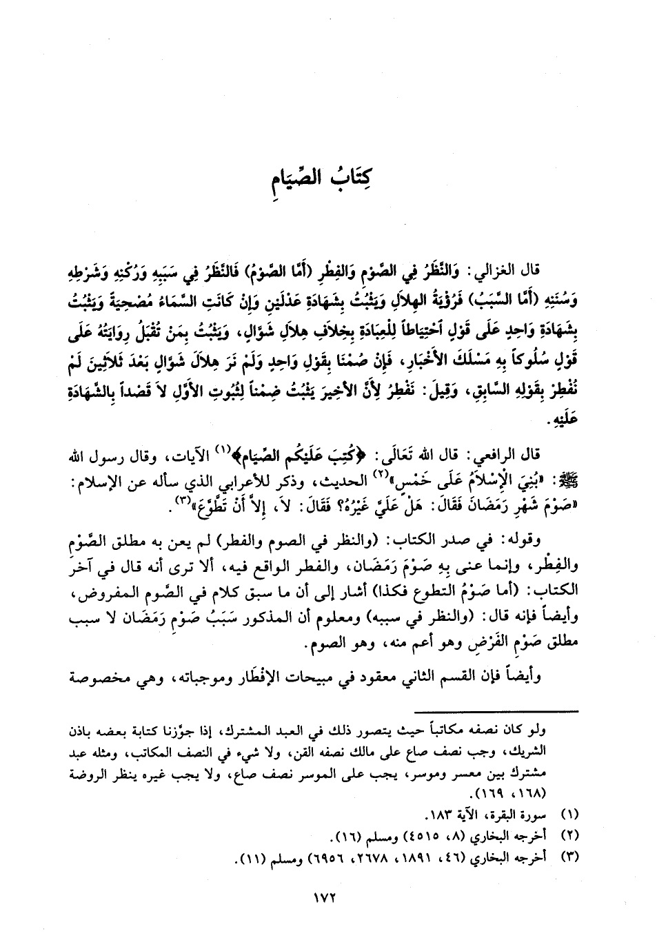 قال الغزالي: وَالنَّظَرُ فِي الصَّوْمِ وَالفِطْرِ (أَمَّا الصَّوْمُ) فَالنَّظَرُ فِي سَبَبِهِ وَرُكْنِهِ وَشَرْطِهِ وَسُنَنِهِ (أَمَّا السَّبَبُ) فَرُؤْيَةُ الهِلاَلِ وَيَثْبُتُ بِشَهَادَةِ عَدْلَيْنِ وَإِنْ كَانَتِ السَّمَاءُ مُصْحِيَةَ وَيَثْبُتُ بِشَهَادَةِ وَاحِدٍ عَلَى قَوْلِ احْتِيَاطاً لِلْعِبَادَةِ بِخِلاَف هِلاَلِ شَوَّالٍ، وَيثْبُتُ بِمَنْ تُقْبَلُ رِوَايَتُهُ عَلَى قَوْلٍ سُلُوكاً بِهِ مَسْلَكَ الأَخْبَارِ، فَإِنْ صُمْنَا بِقَوْلِ وَاحِدٍ وَلَمْ نَرَ هِلاَلَ شَوَّالٍ بَعْدَ ثَلاَثِينَ لَمْ نُفْطِر بِقَوْلهِ السَّابِقِ، وَقِبلَ: نَفْطِرُ لِأَنَّ الأخِيرَ يَثْبُتُ ضِمْنًا لِثُبُوتِ الأَوَّلِ لاَ قَصْداً بِالشَّهَادَةِ عَلَيْهِ.