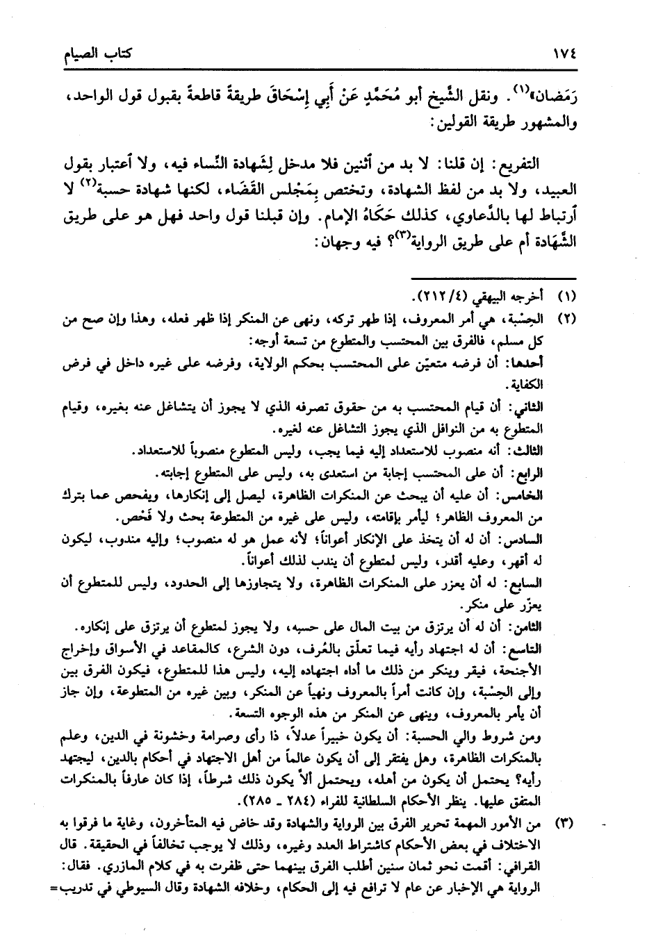 (¬2) الحِسْبة، هي أمر المعروف، إذا ظهر تركه، ونهى عن المنكر إذا ظهر فعله، وهذا وإن صح من كل مسلم، فالفرق بين المحتسب والمتطوع من تسعة أوجه: