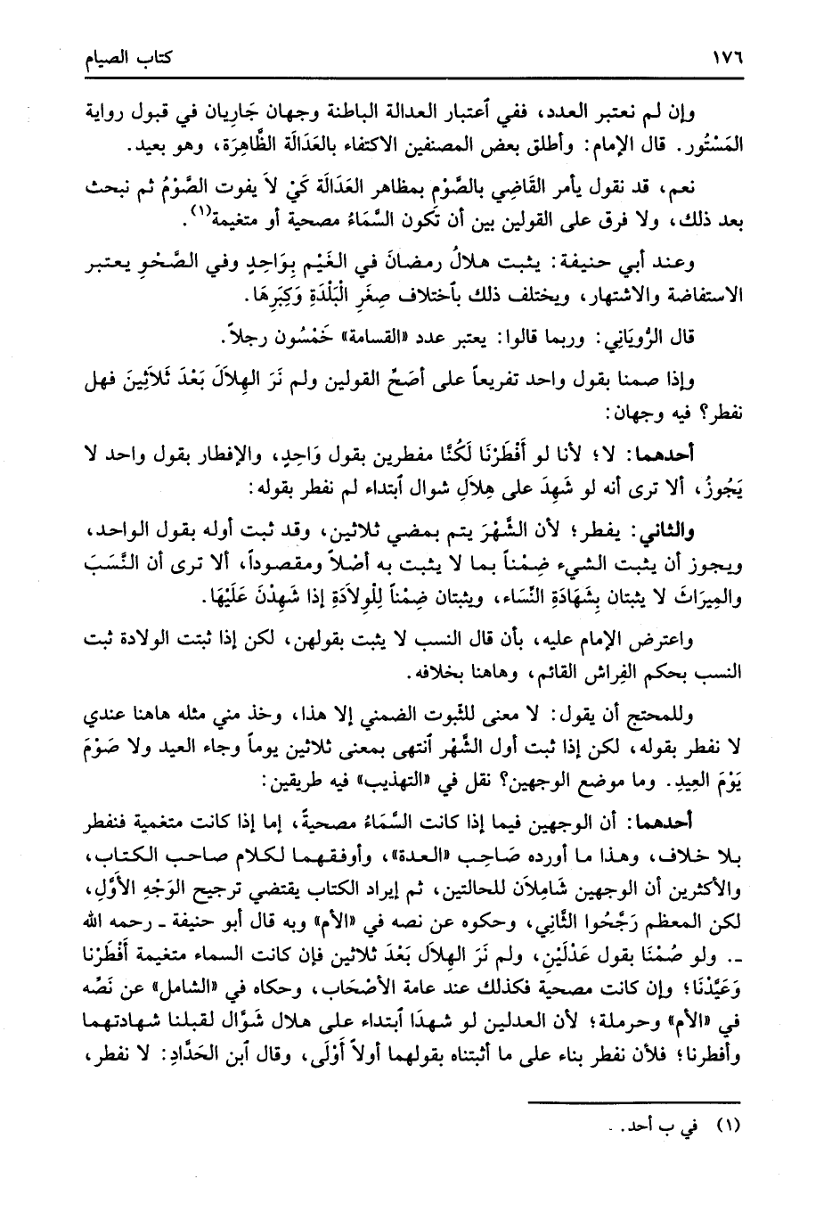 أحدهما: أن الوجهين فيما إذا كانت السَّمَاءُ مصحيةً، إما إذا كانت متغمية فنفطر بلا خلاف، وهذا ما أورده صَاحِب "العدة"، وأوفقهما لكلام صاحب الكتاب، والأكثرين أن الوجهين شَامِلاَن للحالتين، ثم إيراد الكتاب يقتضي ترجيح الوَجْهِ الأَوَّلِ، لكن المعظم رَجَّحُوا الثَّانِي، وحكوه عن نصه في "الأم" وبه قال أبو حنيفة -رحمه الله-. ولو صُمْنَا بقول عَدْلَيْنِ، ولم نَرَ الهِلاَل بَعْدَ ثلاثين فإن كانت السماء متغيمة أَفْطَرْنا وَعَيَّدْنَا؛ وإن كانت مصحية فكذلك عند عامة الأصْحَاب، وحكاه في "الشامل" عن نَصِّه في "الأم" وحرملة؛ لأن العدلين لو شهدَا ابتداء على هلال شَوَّال لقبلنا شهادتهما وأفطرنا؛ فلأن نفطر بناء على ما أثبتناه بقولهما أولاً أَوْلَى، وقال ابن الحَدَّادِ: لا نفطر،