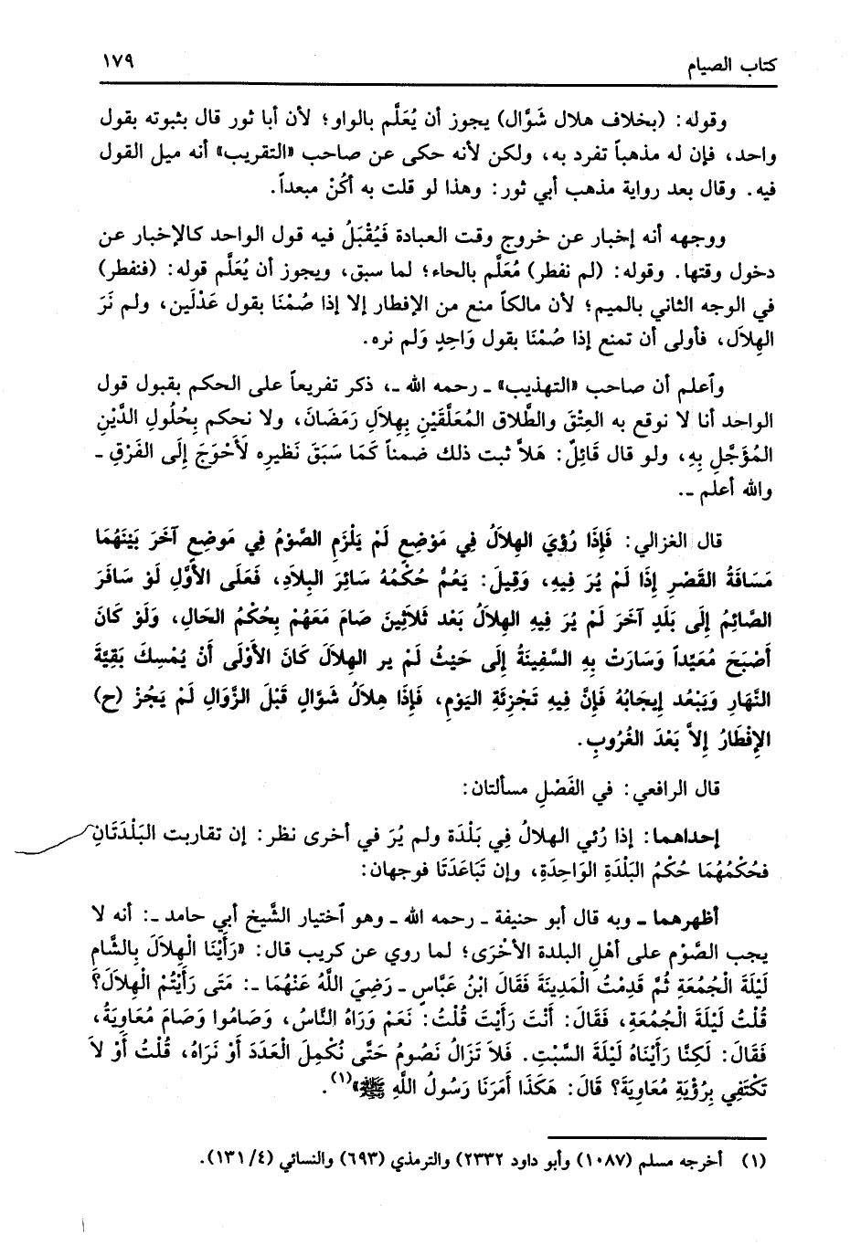 قال الغزالي: فَإذَا رُؤيَ الهِلاَلُ في مَوْضِعٍ لَمْ يَلزَمِ الصَّوْمُ فِي مَوضِع آخَرَ بَيْنَهُمَا مَسَافَةُ القَصْرِ إِذَا لَمْ يُرَ فِيهِ، وَقِيلَ: يَعُمُّ حُكْمُهُ سائِرَ البِلاَدِ، فَعَلَى الأَوَّلِ لَوْ سافَرَ الصَّائِمُ إِلَى بَلَدٍ آخَرَ لَمْ يُرَ فِيهِ الهِلاَلُ بَعْد ثَلاِثينَ صَامَ مَعَهُمْ بِحُكْمُ الحَالِ، وَلَوْ كَانَ أَصْبَحَ مُعَيِّداً وَسَارَت بِهِ السَّفِينَةُ إِلَى حَيْثُ لَمْ ير الهِلاَلَ كَانَ الأَوْلَى أَن يُمْسِكَ بَقِيَّةَ النَّهَارِ وَيَبْعُد إِجَابُهُ فَإِنَّ فِيهِ تَجزِئَةِ اليَوْمِ، فَإذَا هِلاَلُ شَوَّالِ قَبلَ الزَّوَالِ لَمْ يَجُزْ (ح) الإفْطَارُ إِلاَّ بَعْدَ الغُرُوبِ.
