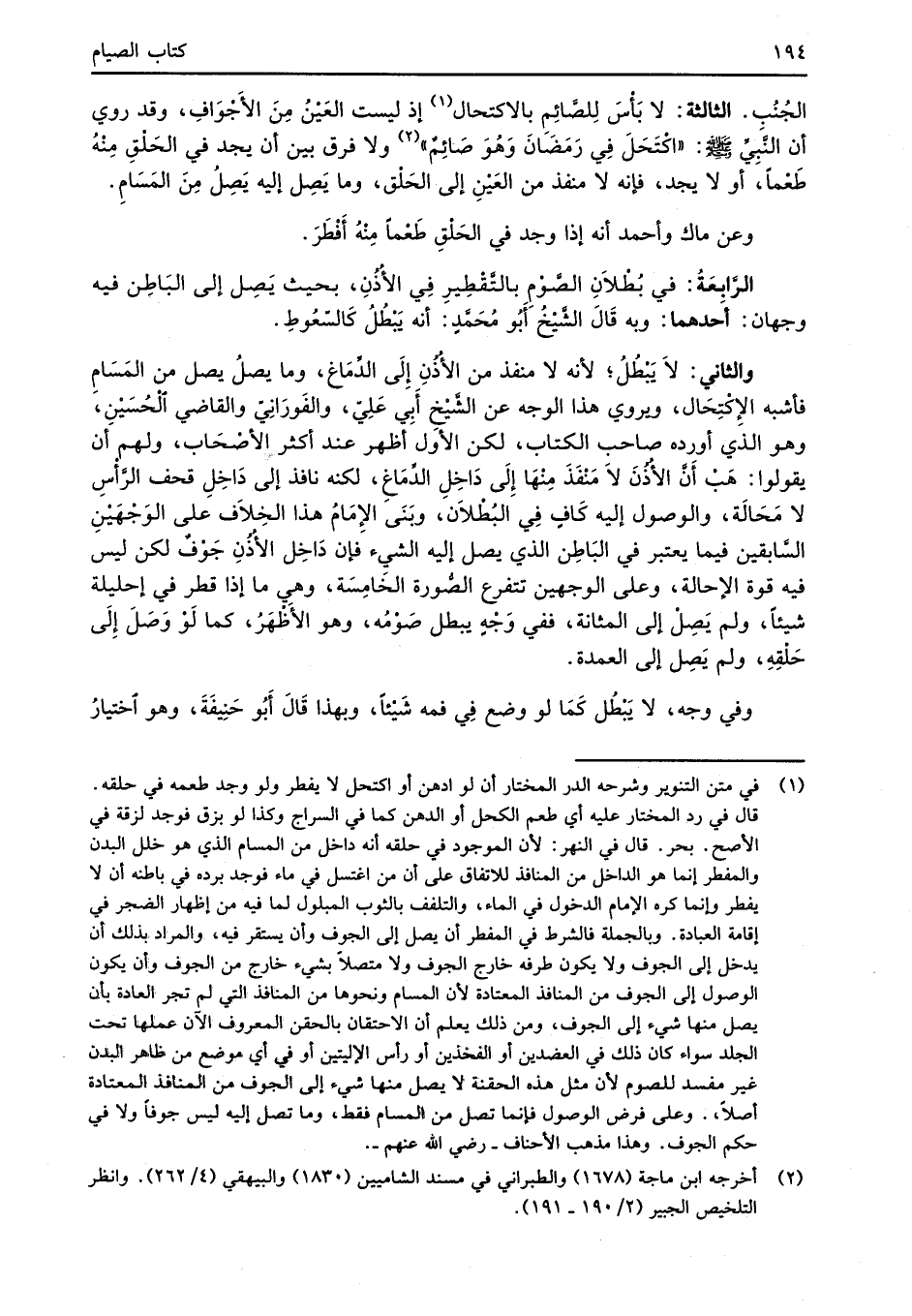 (¬1) في متن التنوير وشرحه الدر المختار أن لو ادهن أو اكتحل لا يفطر ولو وجد طعمه في حلقه. قال في رد المختار عليه أي طعم الكحل أو الدهن كما في السراج وكذا لو بزق فوجد لزقة في الأصح. بحر. قال في النهر: لأن الموجود في حلقه أنه داخل من المسام الذي هو خلل البدن والمفطر إنما هو الداخل من المنافذ للاتفاق على أن من اغتسل في ماء فوجد برده في باطنه أن لا يفطر وإنما كره الإمام الدخول في الماء، والتلفف بالثوب المبلول لما فيه من إظهار الضجر في إقامة العبادة. وبالجملة فالشرط في المفطر أن يصل إلى الجوف وأن يستقر فيه، والمراد بذلك أن يدخل إلى الجوف ولا يكون طرفه خارج الجوف ولا متصلاً بشيء خارج من الجوف وأن يكون الوصول إلى الجوف من المنافذ المعتادة لأن المسام ونحوها من المنافذ التي لم تجر العادة بأن يصل منها شيء إلى الجوف، ومن ذلك يعلم أن الاحتقان بالحقن المعروف الآن عملهما تحت الجلد سواء كان ذلك في العضدين أو الفخذين أو رأس الإليتين أو في أي موضع من ظاهر البدن غير مفسد للصوم لأن مثل هذه الحقنة لا يصل منها شيء إلى الجوف من المنافذ المعتادة أصلاً،. وعلى فرض الوصول فإنما تصل من المسام فقط، وما تصل إليه ليس جوفاً ولا في حكم الجوف. وهذا مذهب الأحناف -رضي الله عنهم-.