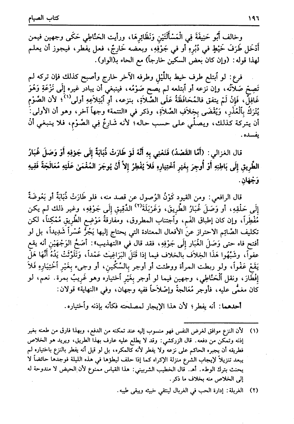 (¬1) لأن النزع موافق لغرض النفس فهو منسوب إليه عند تمكنه من الدفع، وبهذا فارق من طعنه بغير إذنه وتمكن من دفعه. قال الزركشي: وقد لا يطلع عليه عارف بهذا الطريق، ويريد هو الخلاص فطريقه أن يجبره الحاكم على نزعه ولا يفطر لأنه كالمكره، بل لو قيل أنه يفطر بالنزع باختياره لم يبعد تنزيلاً لإيجاب الشرع منزلة الإكراه كما إذا حلف ليطؤها في هذه الليلة فوجدها حائضاً لا يحنث بترك الوطء. أهـ. قال الخطيب الشربيني: هذا القياس ممنوع لأن الحيض لا مندوحة له إلى الخلاص منه بخلاف ما ذكر.