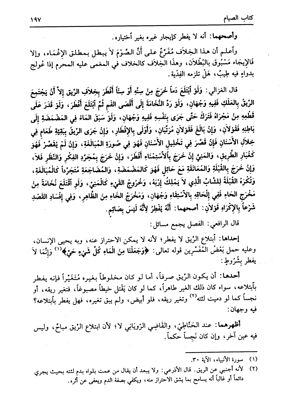 قال الغزالي: وَلَو ابْتَلَعَ دَمًا خَرَجَ مِنْ سِنِّهِ أَوْ سِتاً أَفْطَرَ بِخِلاَفِ الرِّيق إِلاَّ أَنْ يَجْتَمِعَ الرِّيقُ بِالعَلَكِ فَفِيهِ وَجْهَانِ، وَلَو رَدَّ النُّخَامَةَ إلَى أَقْصَى الفَمِ ثُمَّ ابْتَلَعَ أَفْطَرَ، وَلَوْ قَدَرَ عَلَى قَطْعِهِ مِنْ مَجْرَاهُ فَتَرَكَ حَتَّى جَرَى بنَفْسِهِ فَفِيهِ وَجْهَانِ، وَلَوْ سَبَقَ المَاءُ فِي المَضْمَضَةِ إِلَى بَاطِنِهِ فَقَوْلاَنِ، وَإِنْ بَالَغَ فَقَوْلاَنِ مُرَتَّبَانِ، وَأَوْلَى بِالإِفْطَارِ، وإنْ جَرَى الرِّيقُ بِبَقِيَّةِ طَعَامِ فِي خِلاَلِ الأَسنَانِ فَإِنْ قَصَّرَ فِي تَخْلِيلِ الأَسْنَانِ فَهُوَ فِي صُورَةِ المُبَالَغَةِ، وَإِنْ لَمْ يُقَصِّرْ فَهُوَ كَغُبَارِ الطَّرِيقِ، وَالمَنِيُّ إِنْ خَرَجَ بِالاسْتِمْنَاءِ أَفْطَرَ، وَإِنْ خَرَجَ بِمُجَرَّدِ الفِكْرِ وَالنَّظَرِ فَلاَ، وَإنْ خَرَجَ بِالقُبْلَةِ وَالمُعَانَقَةِ مَعَ حَائِلٍ فَهُوَ كَالمَضْمَضَةِ، وَالمُضَاجَعَةِ مُتَجَرِّداً كَالْمُبَالَغَةِ، وَتُكْرَهُ القُبْلَةُ لِلشَّابِّ الَّذي لاَ يَمْلِكُ إرْبَهُ، وَخُرُوجُ القَيْءِ كَالْمَنِيِّ، وَلَوِ اقْتَلَعَ نُخَامَةً مِنْ مَخْرَجِ الحَاءِ فَفِي إِلْحَاقِهِ بِالاسْتِقَاءِ وَجْهَانِ، وَمَخْرَجُ الخَاءِ مِنَ الظَّاهِرِ، وَفِي إِفْسَادِ القَصْدِ شَرْعاً بِالِإكْرَاهِ قَوْلاَنِ: أصحهما: أَنَّهُ يُفْطِرُ لِأَنَّهُ لَيْسَ بِصَائِمِ.